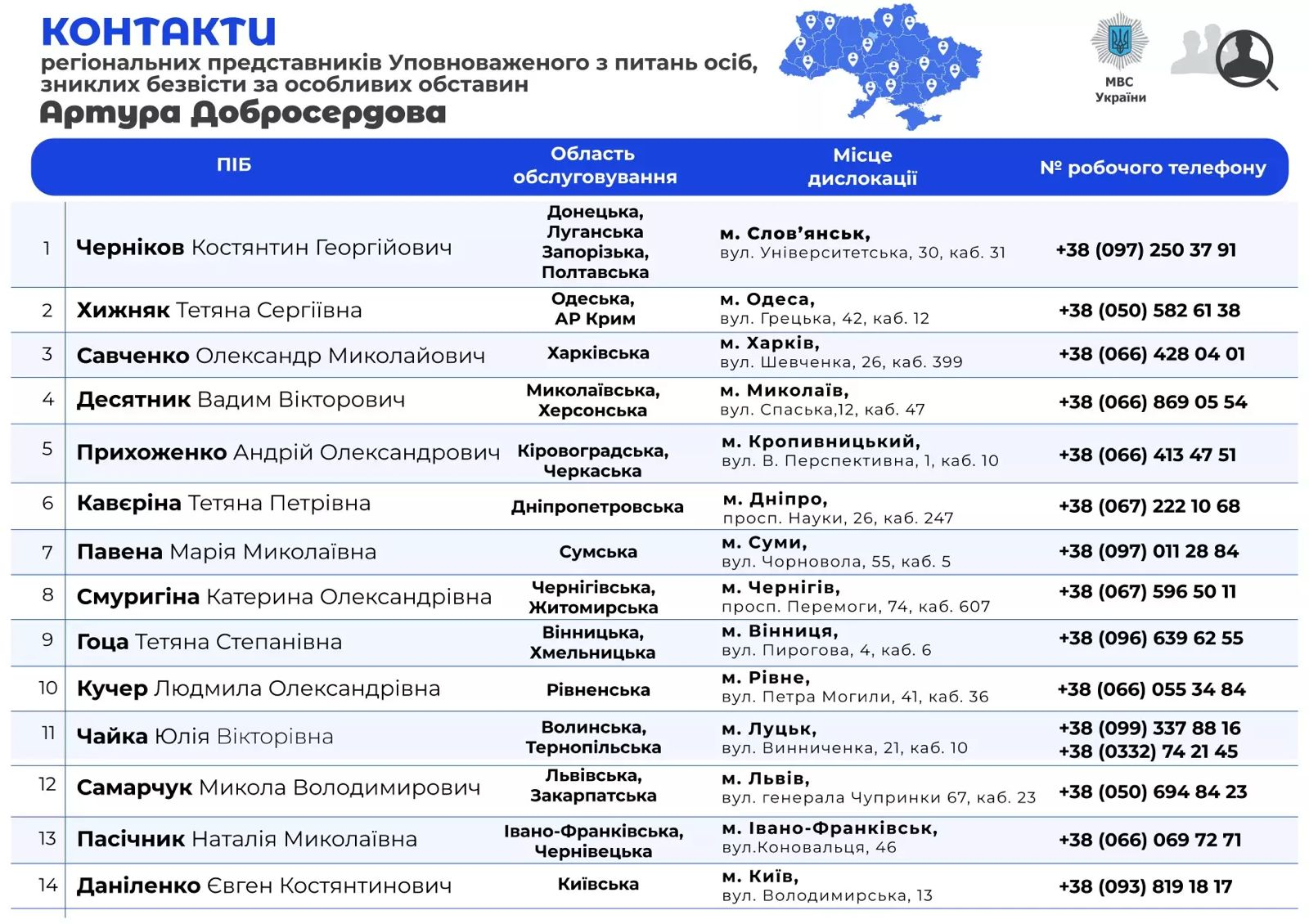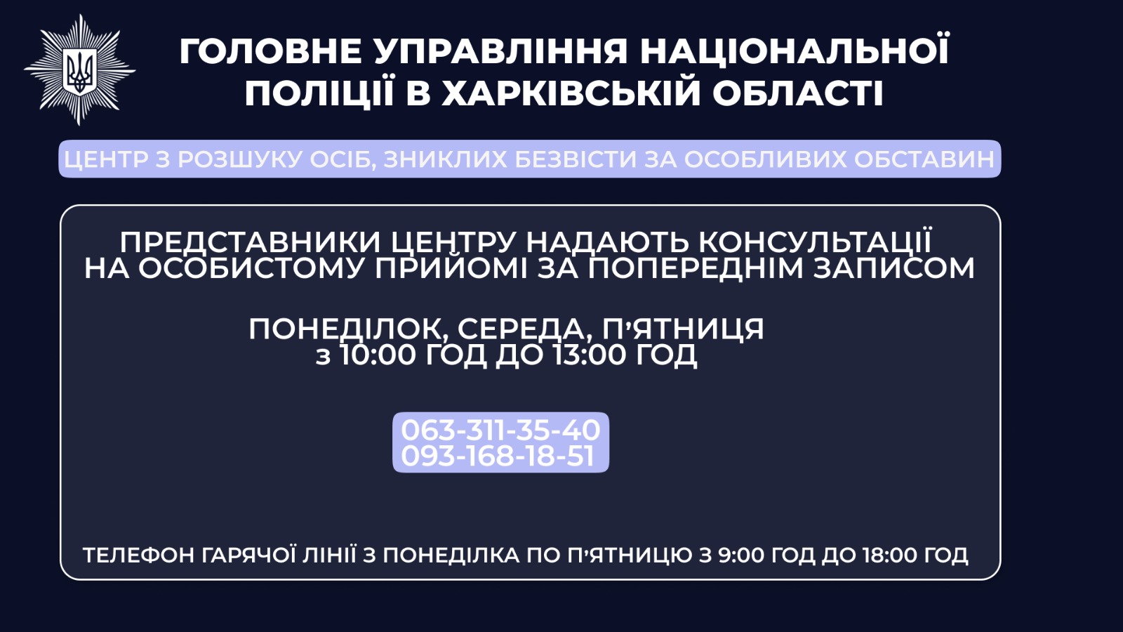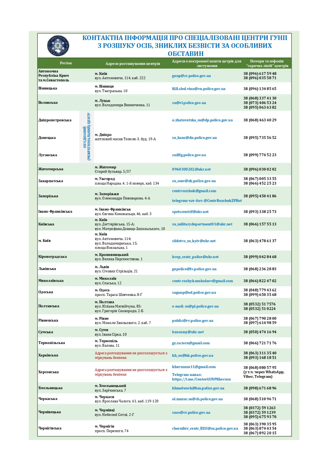 Для інформування громадян з 01.10.2023 року МВС України запроваджено «гарячу лінію» Уповноваженого з питань осіб, зниклих безвісти за особливих обставин за номером 0 800 103 333.