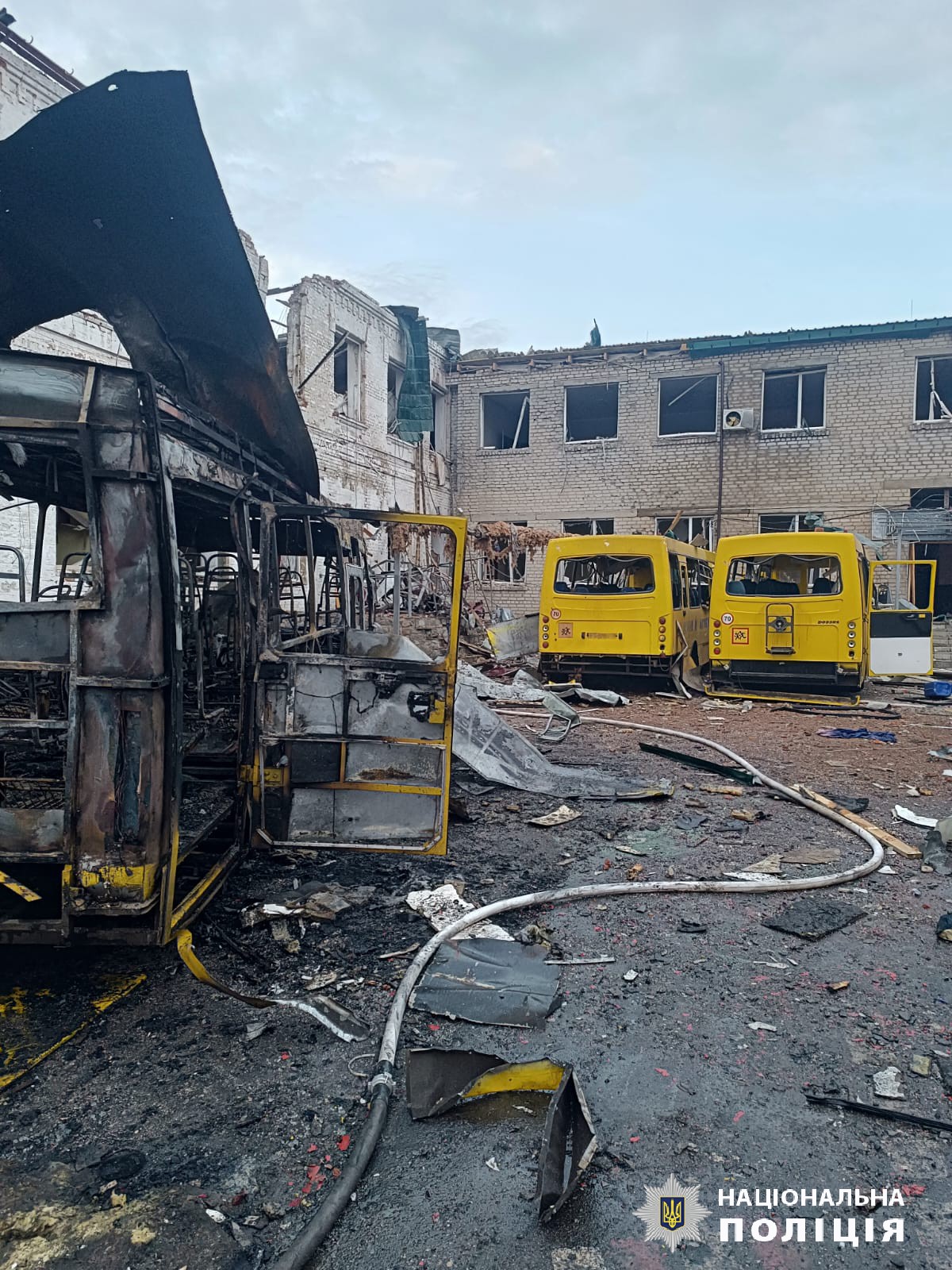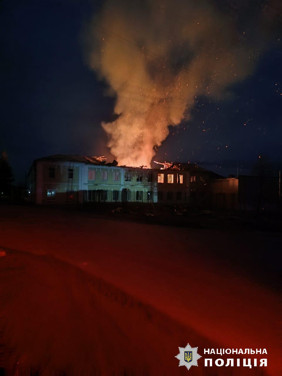 Внаслідок влучання двох ворожих БпЛА в будівлю навчального закладу у місті Богодухів сталася пожежа. Пошкоджені приватні домоволодіння та шкільні автобуси. У трьох жінок та одного чоловіка гостра реакція на стрес.