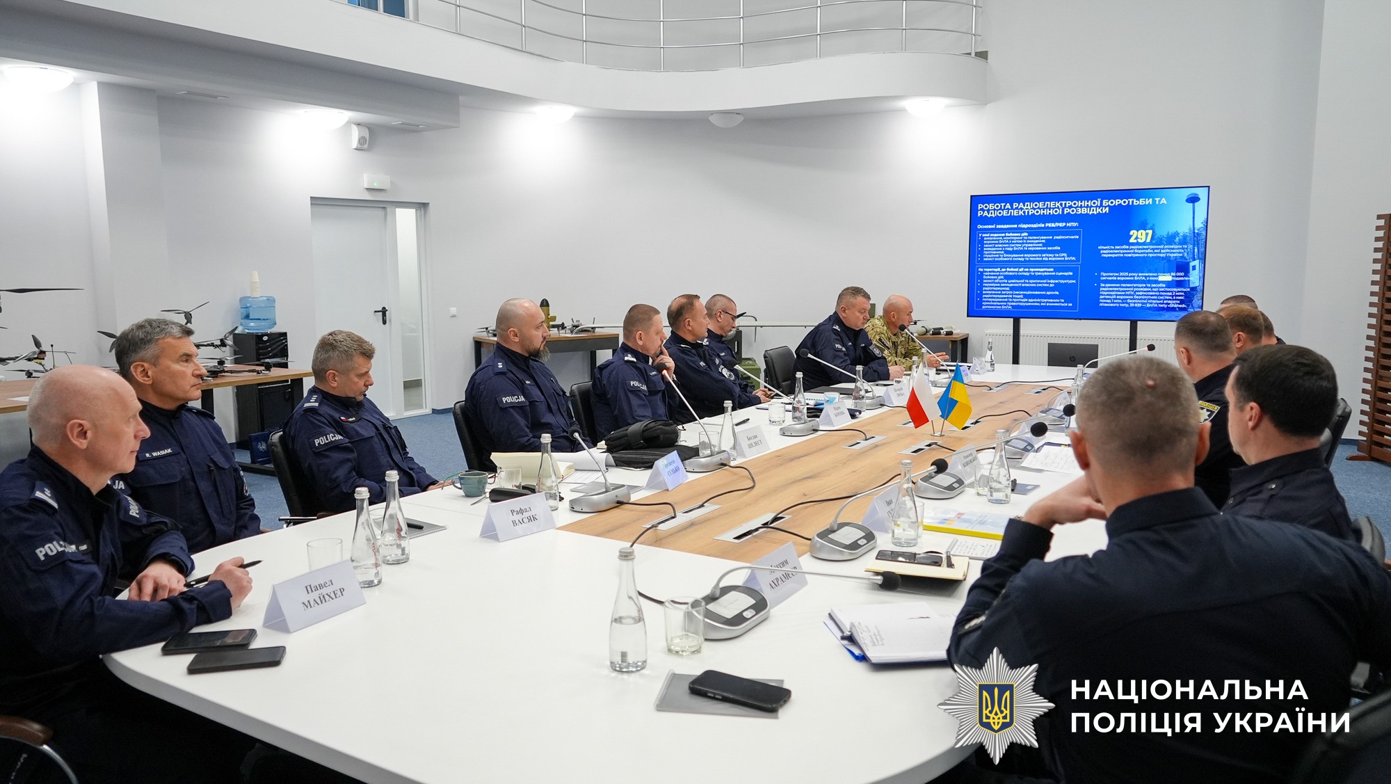 Під час зустрічі польські колеги ознайомилися з безпілотною технікою, що перебуває на озброєнні Нацполіції. Сергій Кравченко представив розвідувальні та ударні БпЛА, зокрема FPV-бомбери літакового типу.