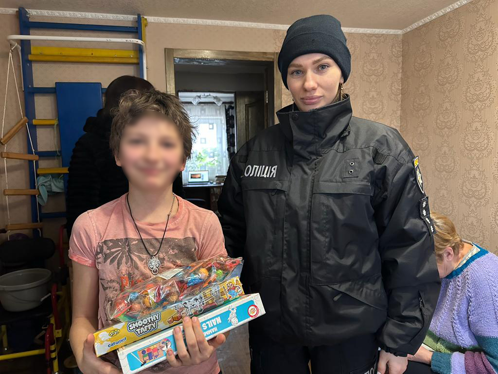 Поліцейські сектору ювенальної превенції ХРУП № 1 разом зі службою у справах дітей Основ'янського району перевірили умови проживання сімей та привезли солодощі та дитячі іграшки.