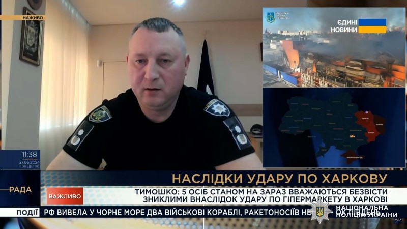 В етері телемарафону «Єдині новини» керівник ГУНП в Харківській області розповів про наслідки ракетного удару 25 травня по будівельному торговельному центру.