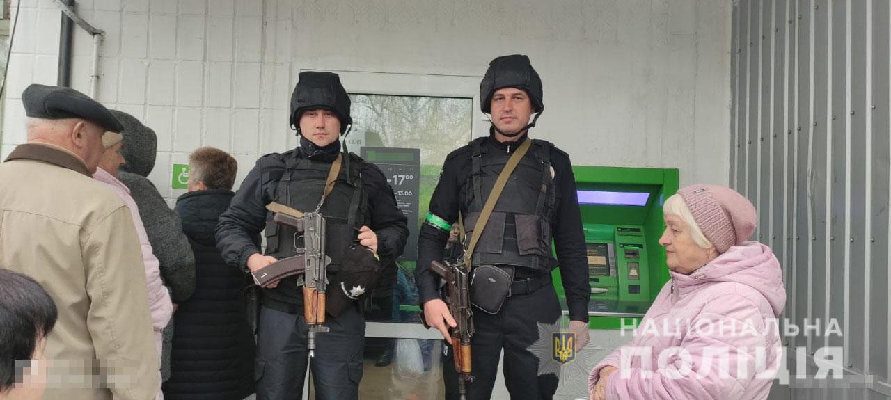 Співробітники Красноградського районного відділення Управління поліції охорони в Харківській області слідкують за безпекою громадян під час отримання грошей.