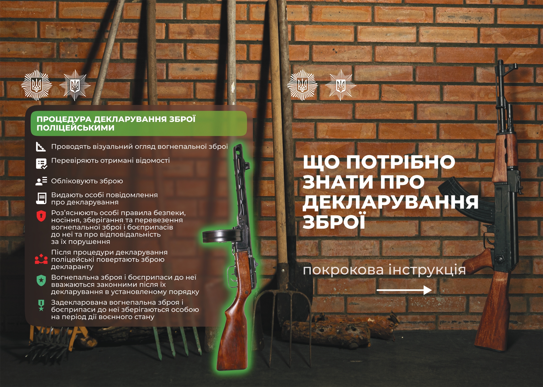 Декларування доступне для громадян віком від 21 року. Для цього необхідно звернутися до підрозділу поліції, повідомити обставини виявлення зброї. Після цього правоохоронці зафіксують її дані, проведуть фотофіксацію та нададуть дозвіл на тимчасове зберігання до завершення воєнного стану.