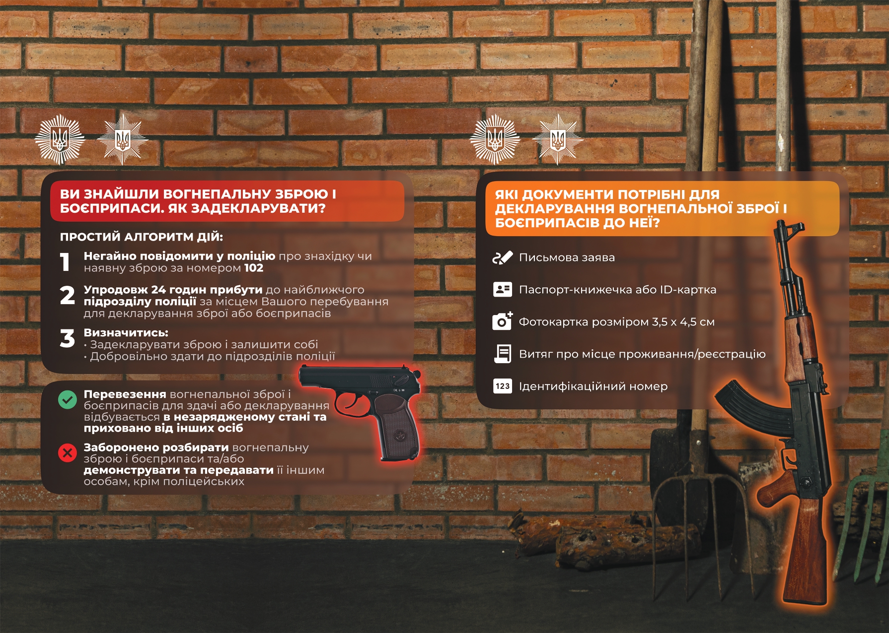 В Україні діє порядок декларування та поводження з вогнепальною зброєю, передбачений законодавством. Ця процедура дозволяє громадянам тимчасово та законно зберігати знайдену зброю під контролем держави. У разі необхідності вона може бути використана для захисту України.
