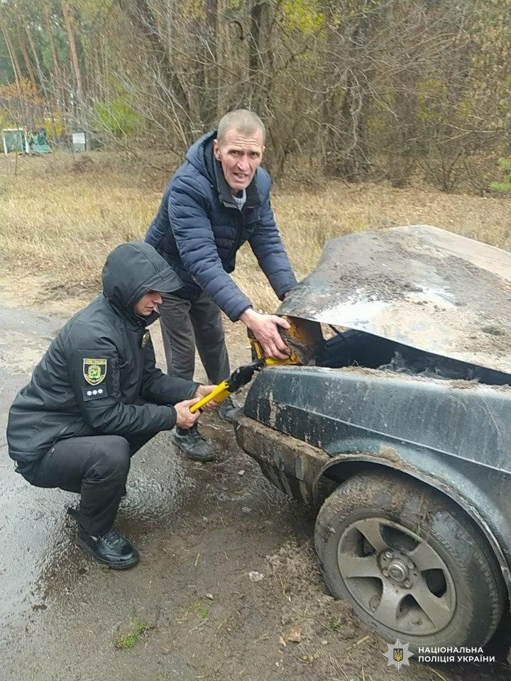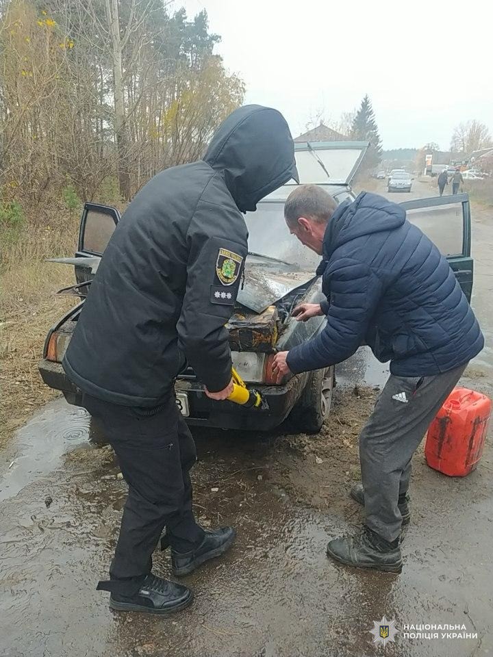 Поліцейські офіцери громади Олександр Лучко та Вадим Заїка в цей час здійснювали патрулювання території району та побачили, що чоловіку потрібна допомога. Вони допомогли водієві загасити пожежу.