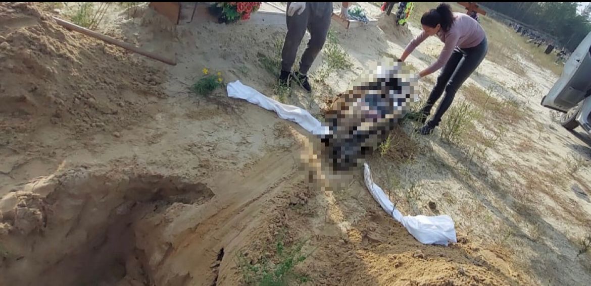 Під час попереднього огляду загиблого встановлено, що померлим є чоловік приблизно 50 років, середнього зросту, одягнений у червону спідню білизну та чорну футболку. У чоловіка виявлені тілесні ушкодження, що ймовірно свідчить про катування.