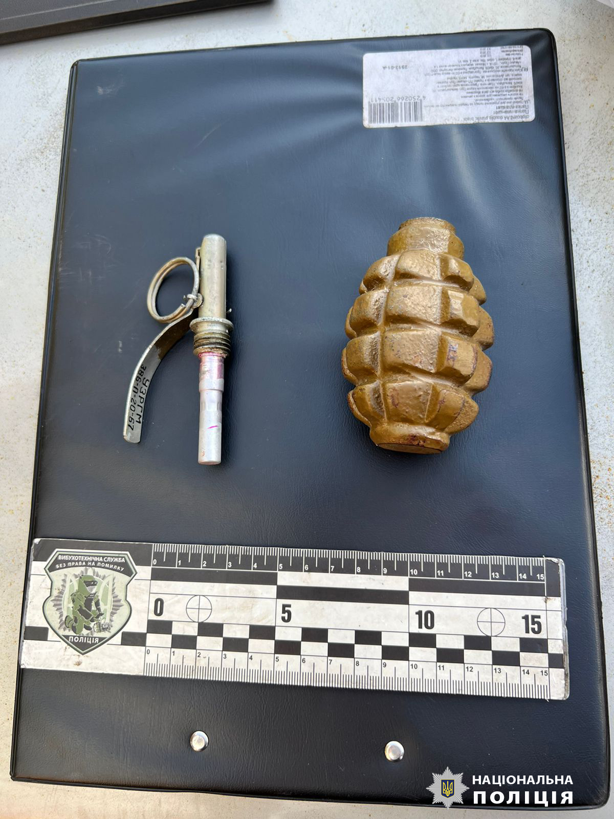 В результаті вилучено корпус ручної осколкової гранати Ф-1, підривач типу УЗРГМ та речовину рослинного походження, схожу на коноплю.