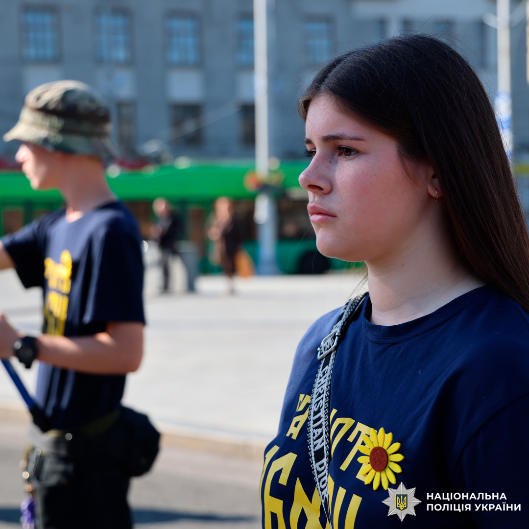 Також на згадку про полеглих героїв на майдані Конституції поліцейські вручили квітки соняшника молоді Харківщини.