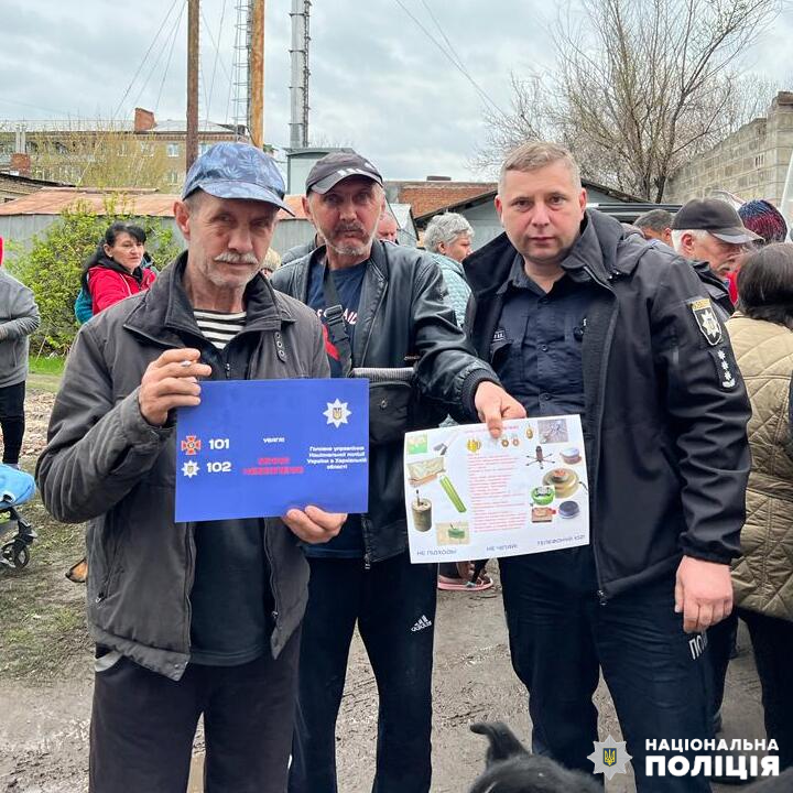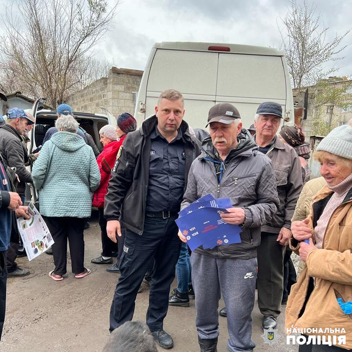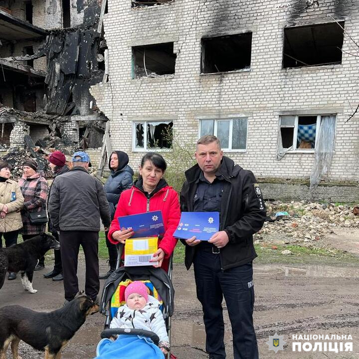 Під час відвідування деокупованого міста Ізюм помічник начальника з гуманітарних питань ГУНП в Харківській області В’ячеслав Марков роздав громадянам інформаційні буклети щодо мінної небезпеки.