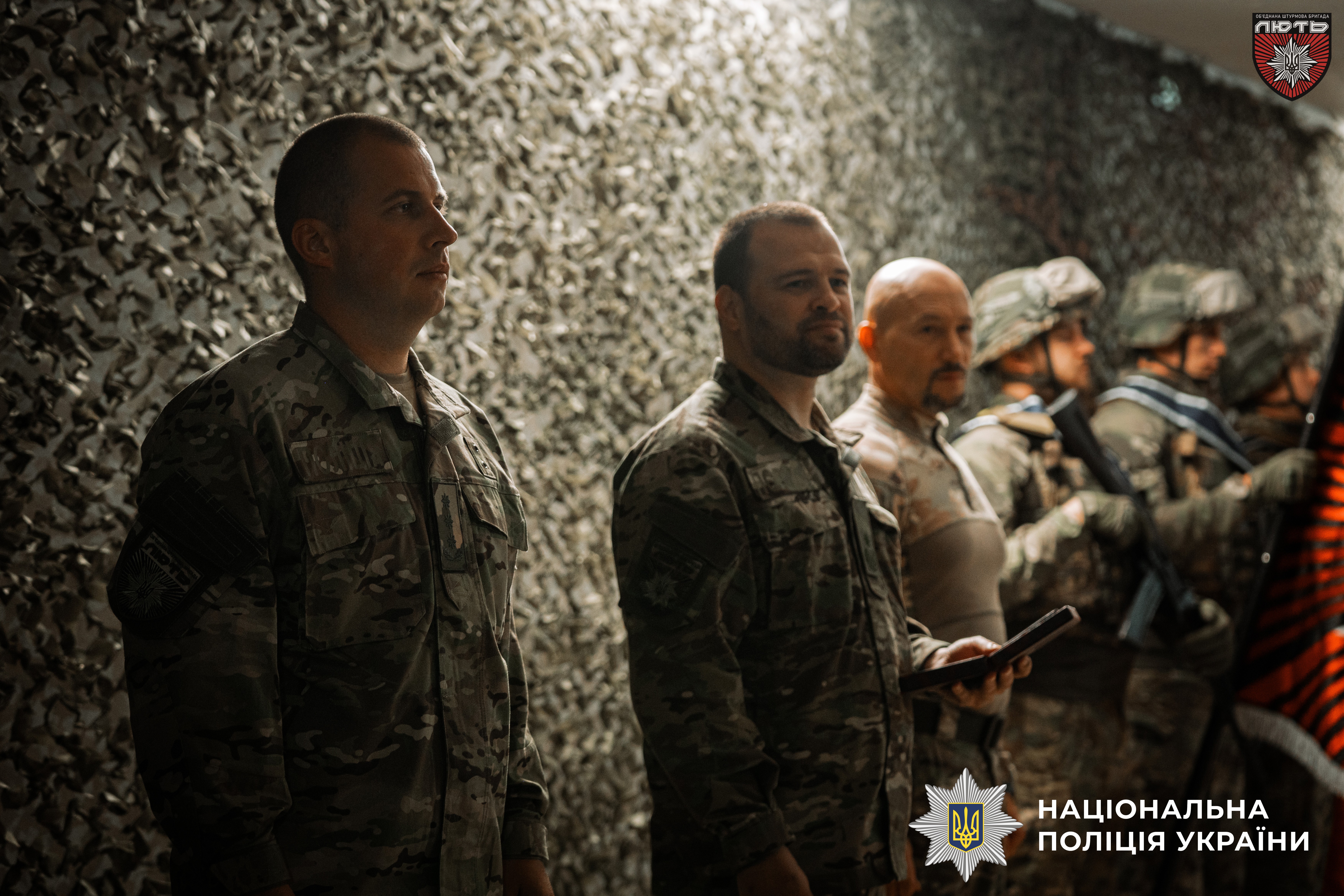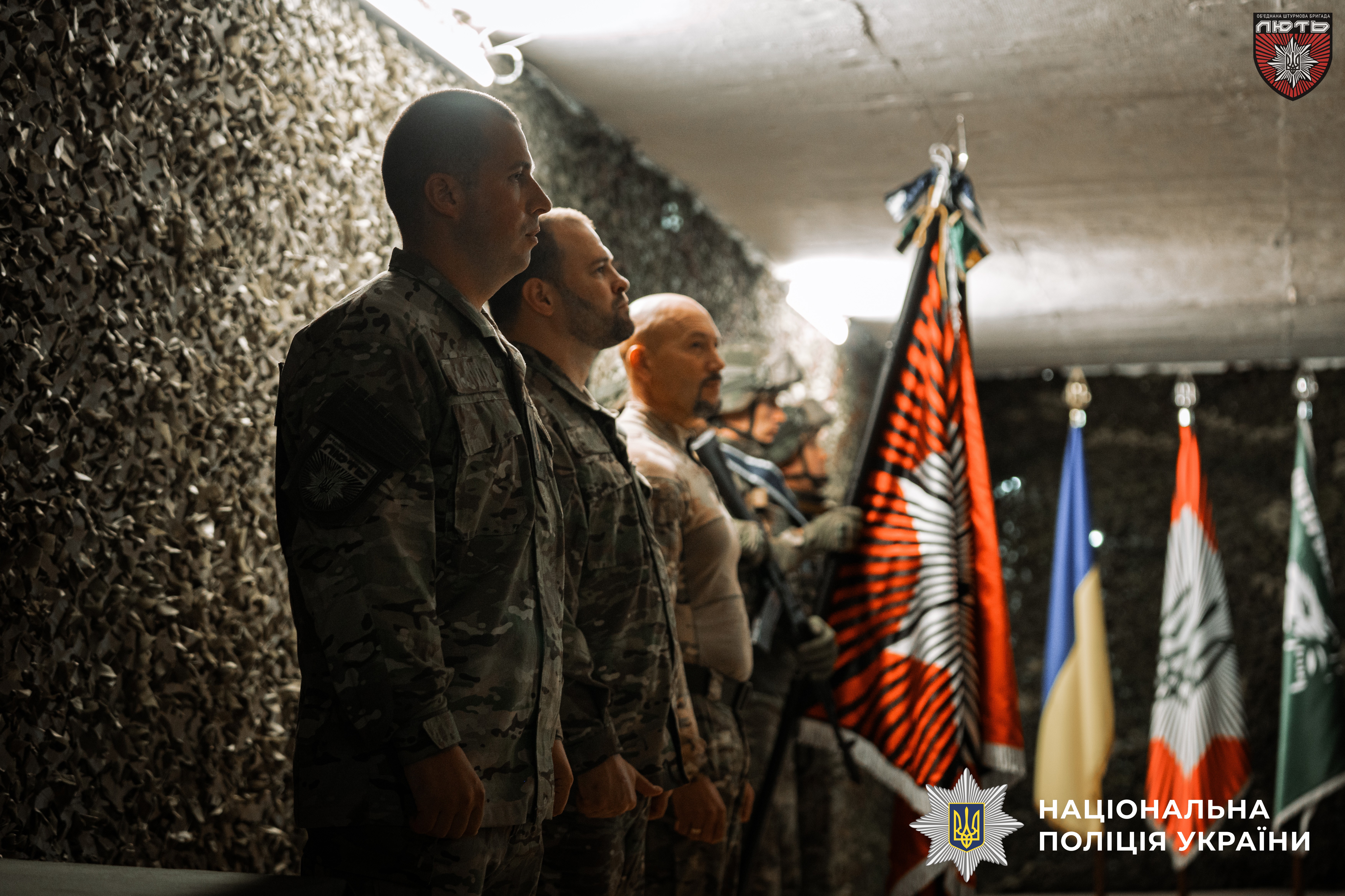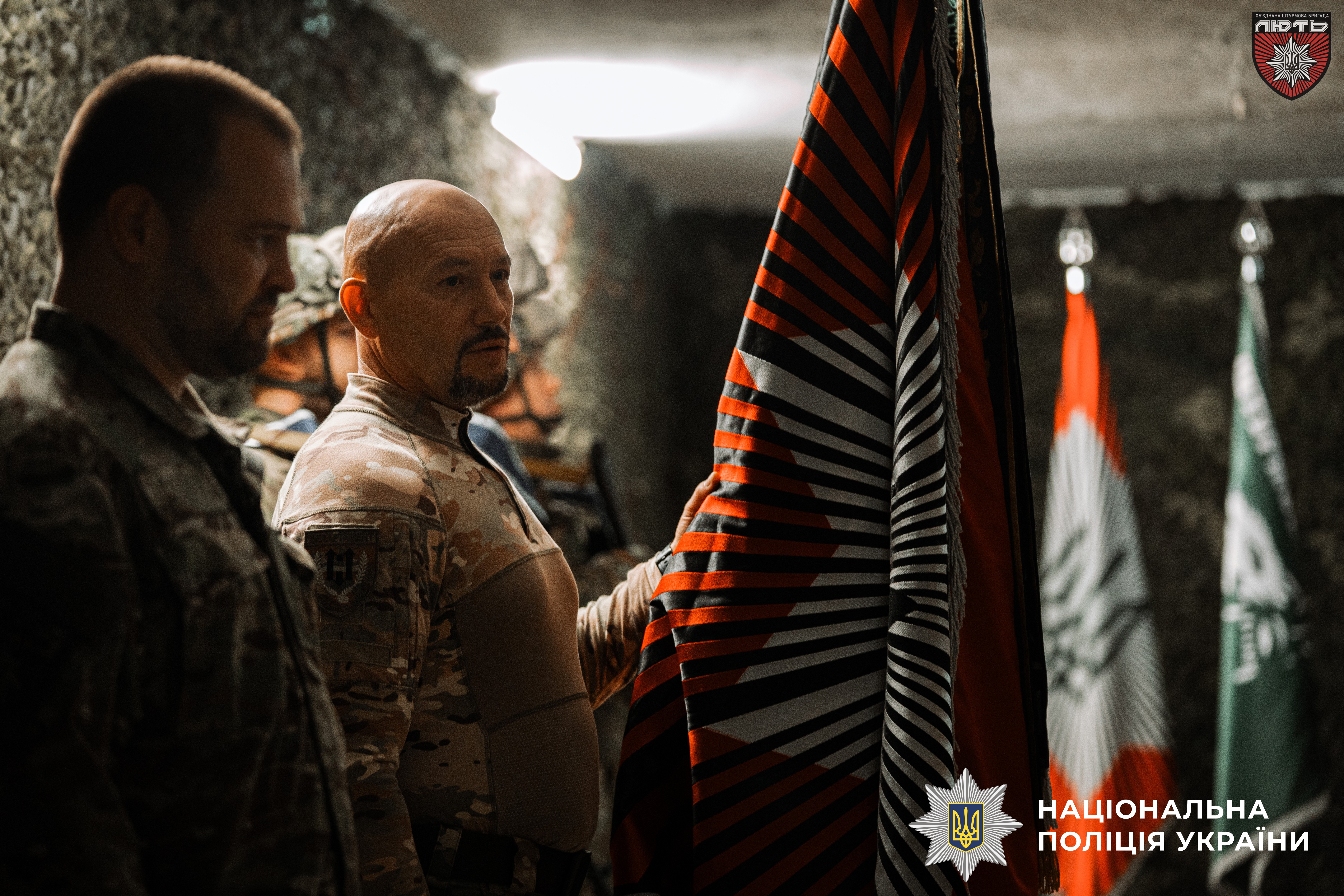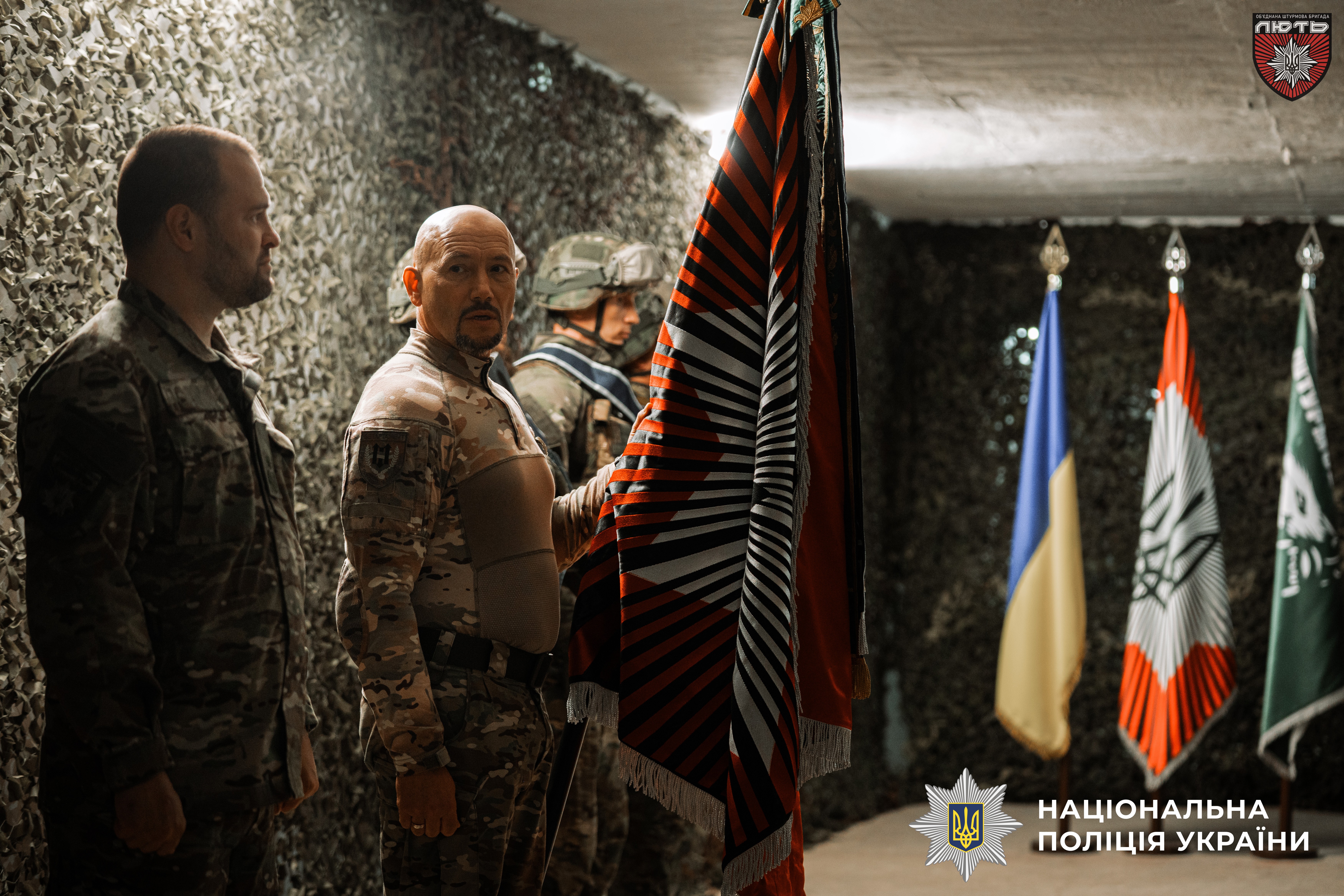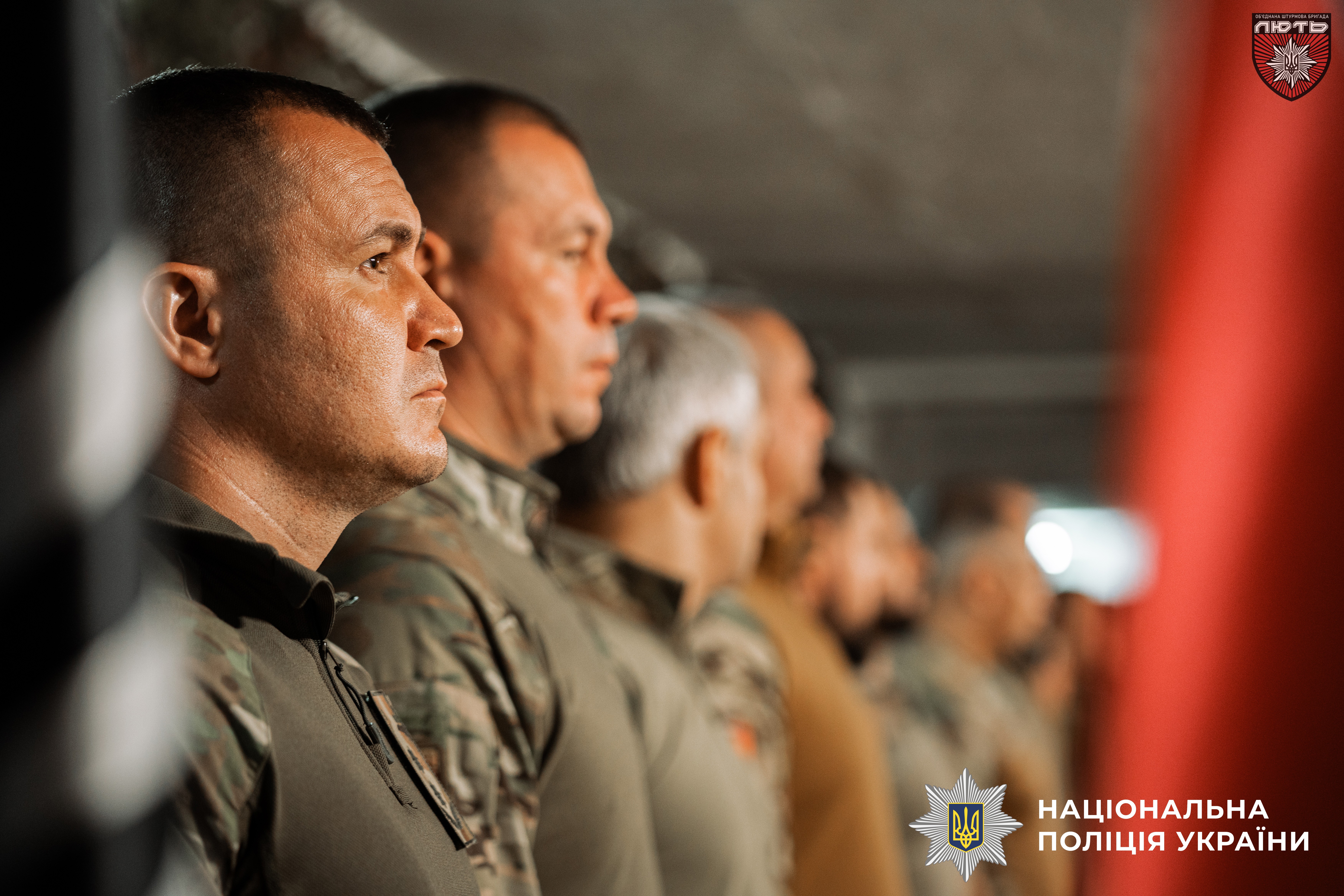 За участі заступника Голови Національної поліції України Олександра Фацевича та першого командира бригади, а нині заступника Командувача Оперативно-стратегічного угруповання військ «Дніпро» Олександра Нетребка, відбулася церемонія передачі бойового прапора новому командиру Об’єднаної штурмової бригади Нацполіції «Лють».