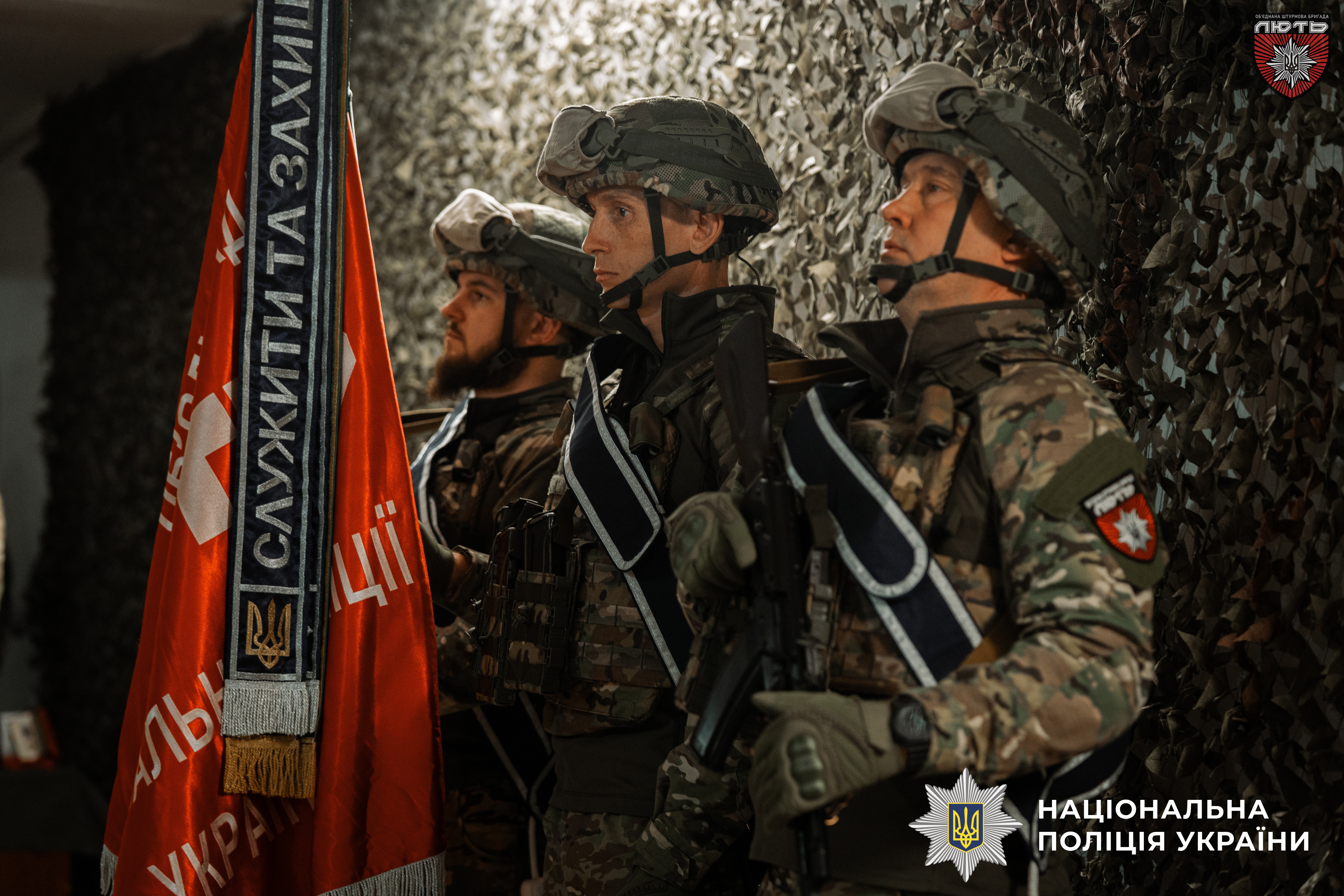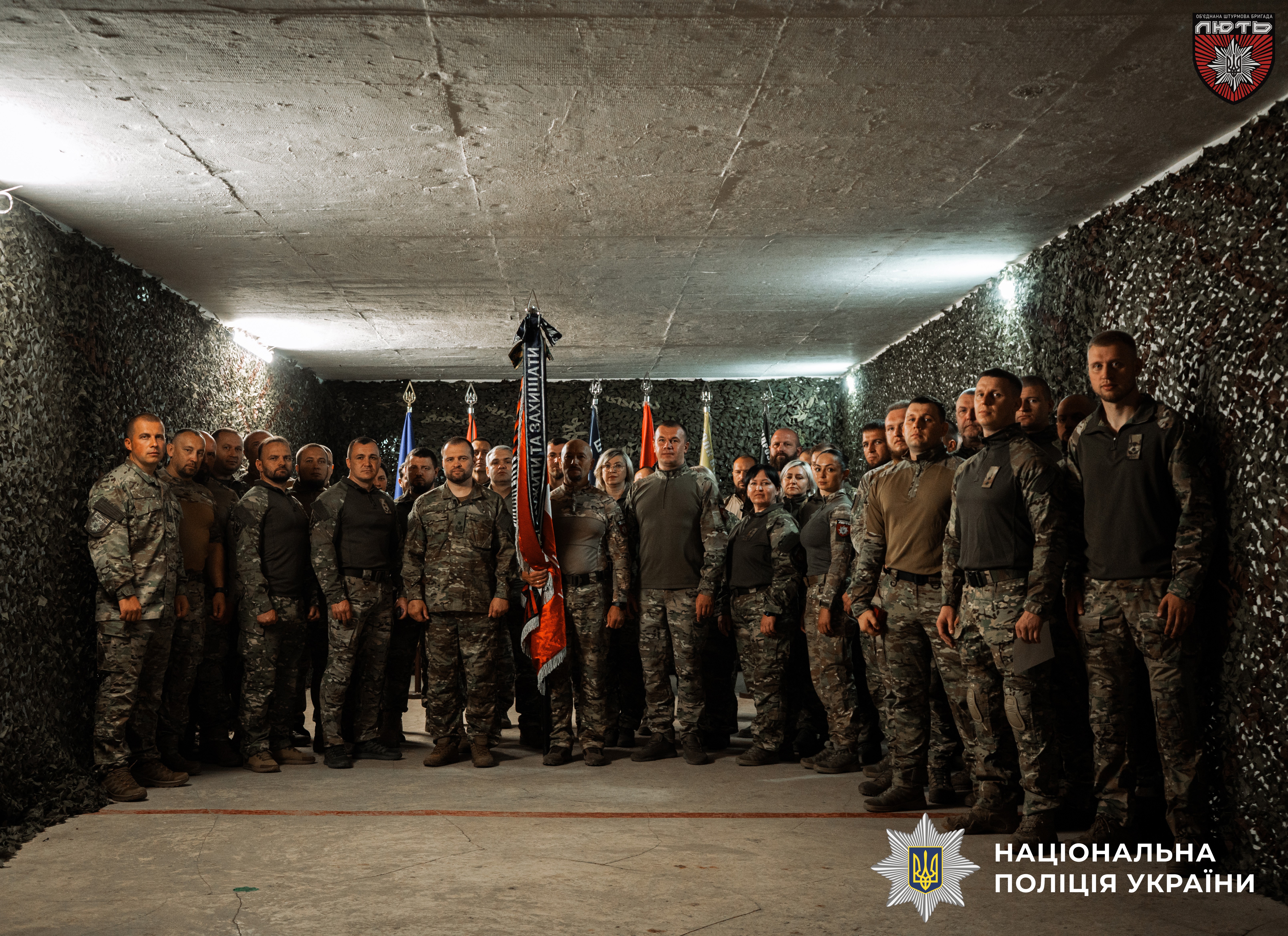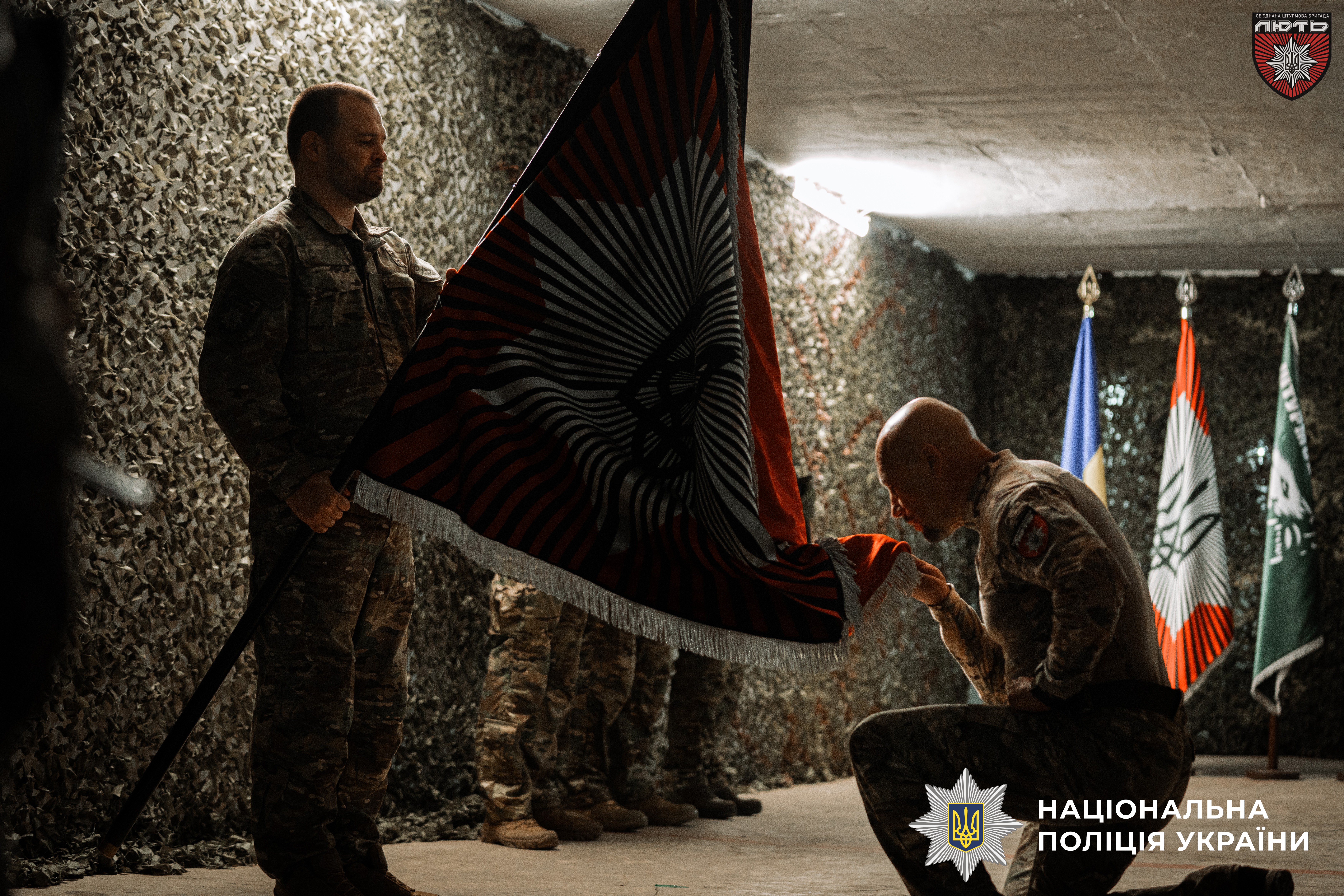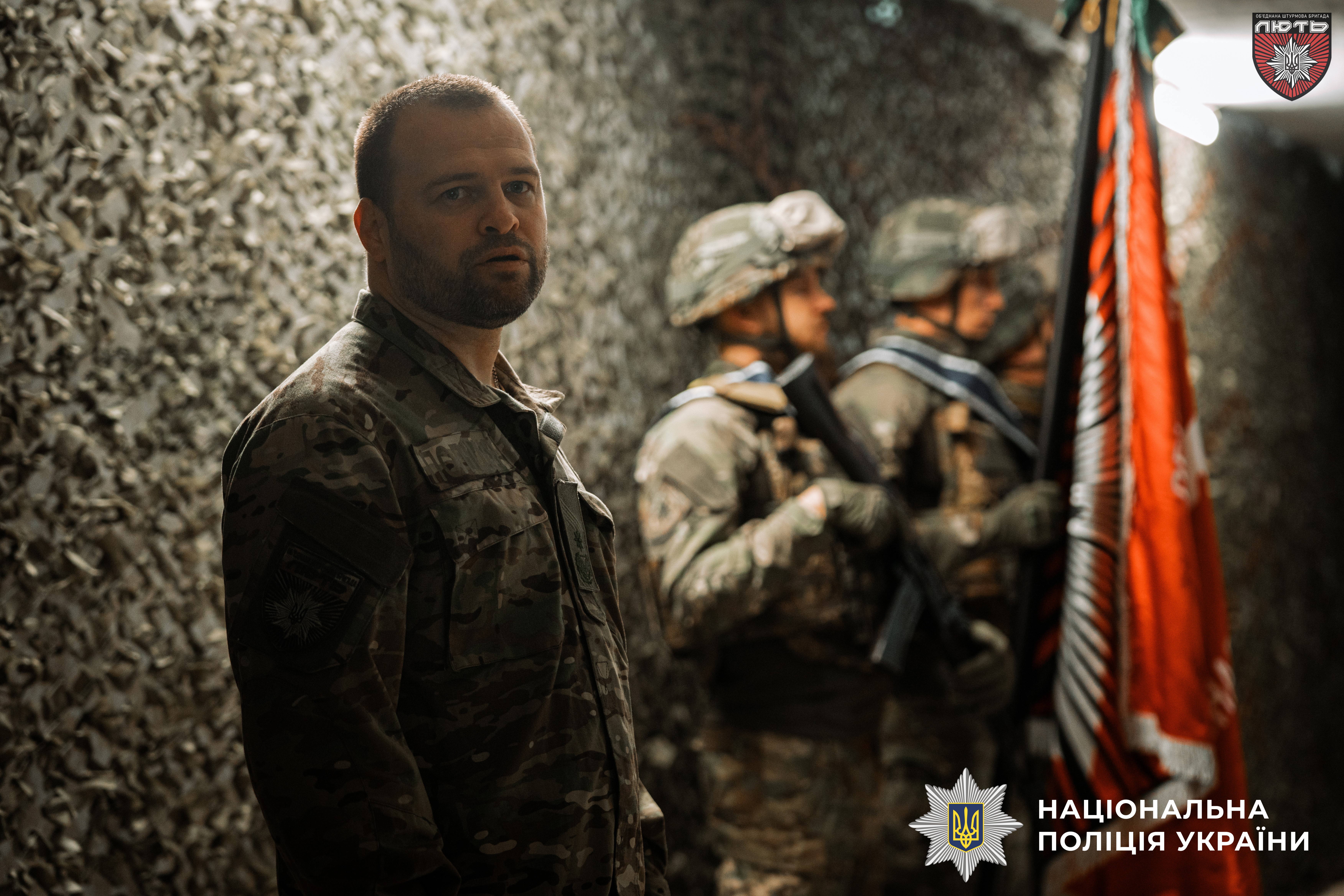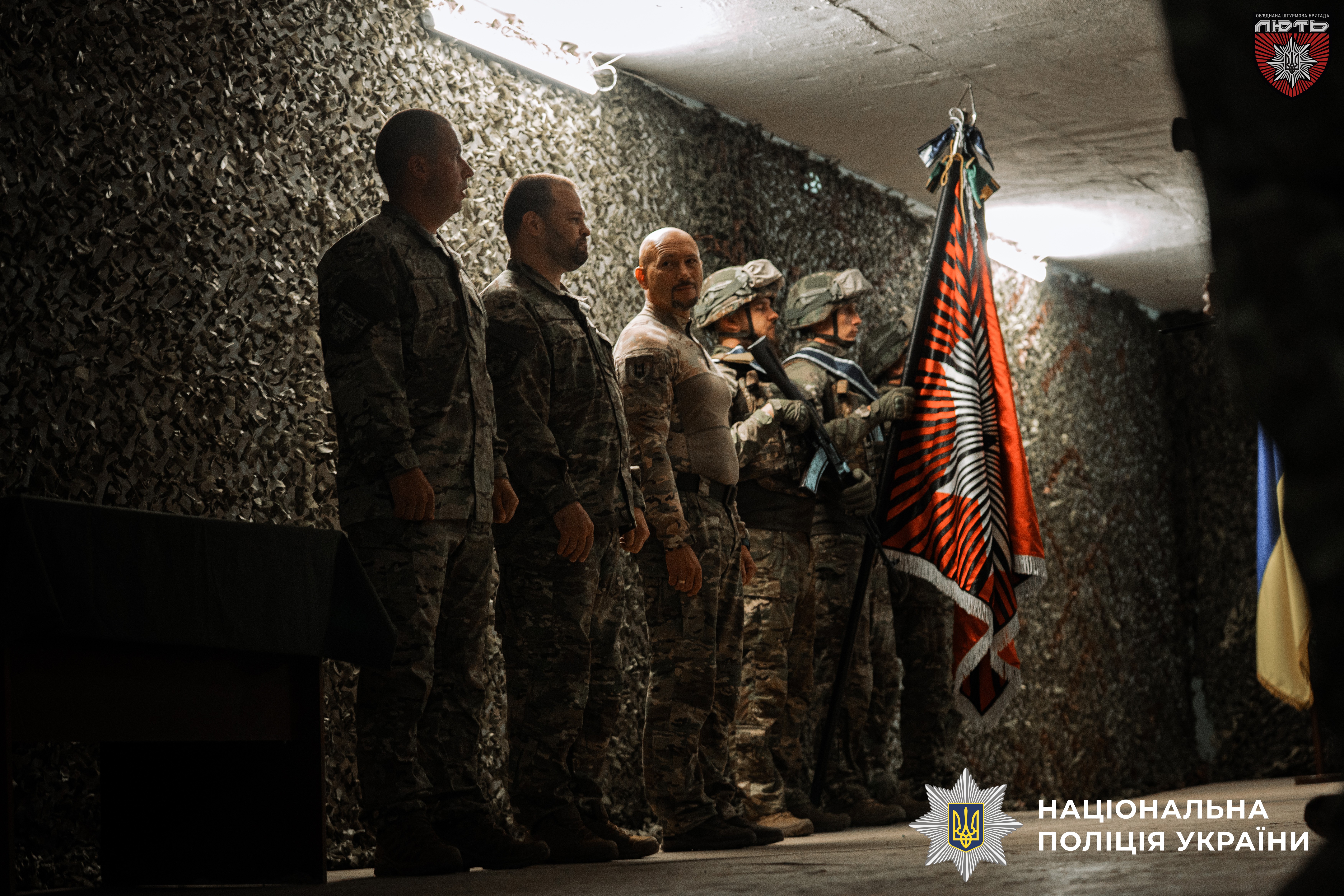 За участі заступника Голови Національної поліції України Олександра Фацевича та першого командира бригади, а нині заступника Командувача Оперативно-стратегічного угруповання військ «Дніпро» Олександра Нетребка, відбулася церемонія передачі бойового прапора новому командиру Об’єднаної штурмової бригади Нацполіції «Лють».