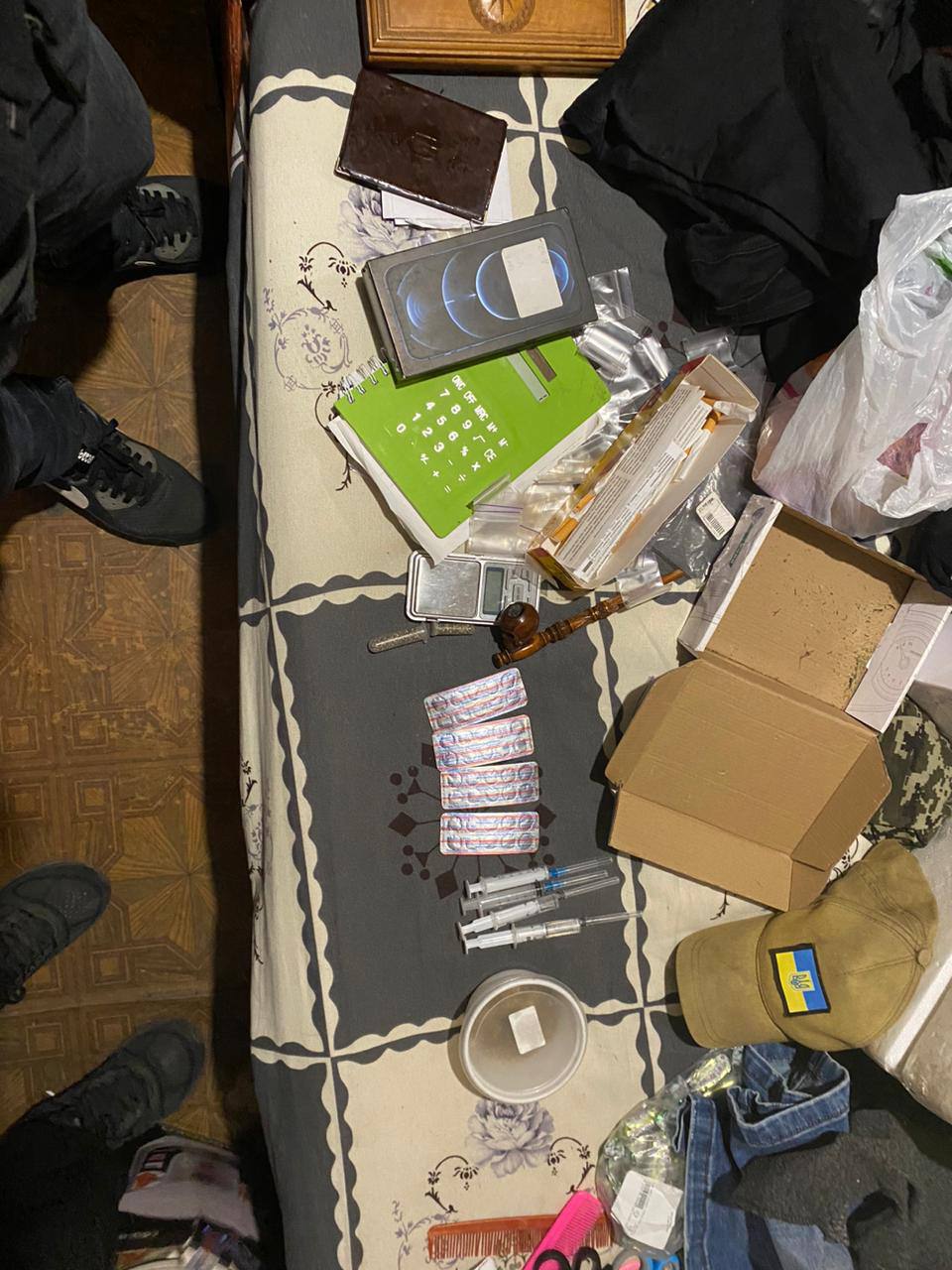 За словами слідчого Слідчого управління ГУНП в Харківській області Олександра Кобилка, під час обшуків вилучено 8 мобільних телефонів, 2 відеокамери, ноутбук, банківські картки, носії інформації, сім-картки, гроші та інші речові докази, які підтверджують злочинну діяльність. Крім того, виявлені електронні ваги, медичні шприци, у тому числі використані, зіп-пакети, упаковані речовини невідомого походження, схожі на наркотичні.