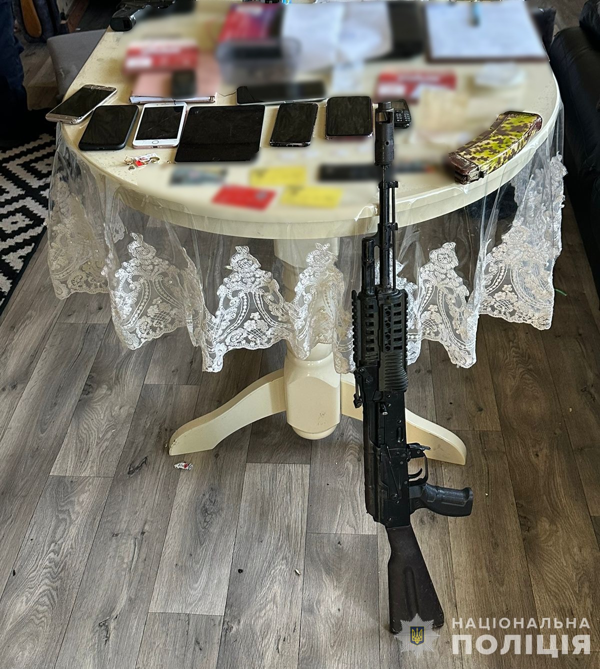 Оперативники та слідчі за силової підтримки полку поліції особливого призначення в Харківській області провели слідчі дії за місцями мешкання фігурантів на території Кривого Рогу. Вилучили 25 мобільних телефонів, банківські карти, комп’ютерну техніку, чорнові записи, автомат Калашникова та набої до нього.
