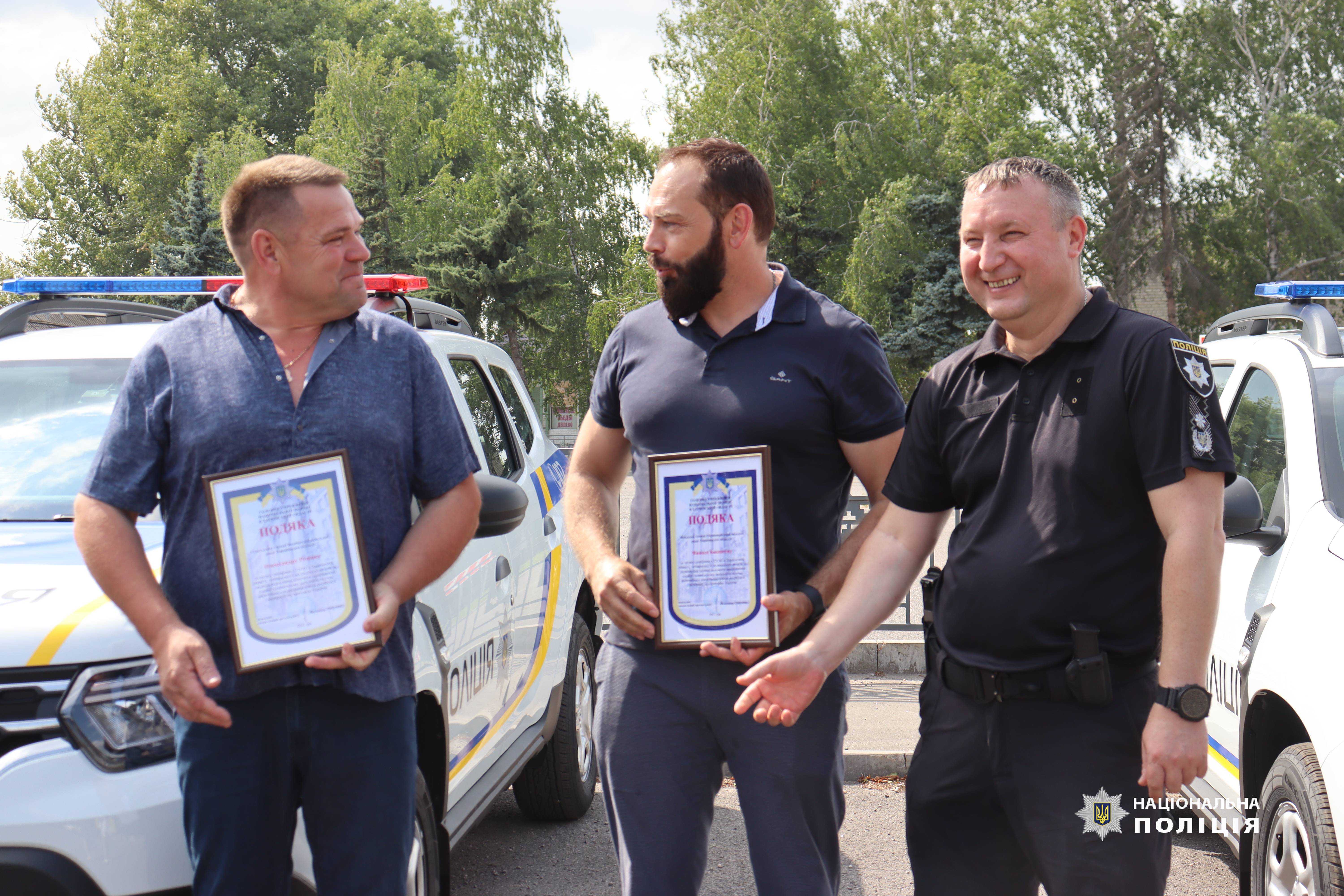 Вручили службові автомобілі працівникам відділення поліції № 1 Лозівського РВП начальник ГУНП в Харківській області Володимир Тимошко та керівники територіальних громад Олександр Резнік і Микола Бакшеєв.