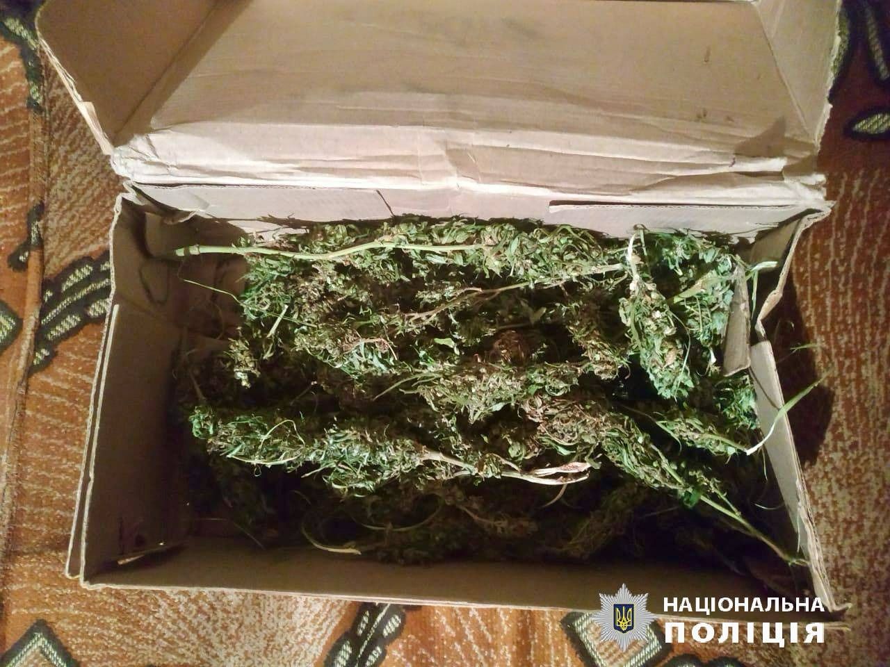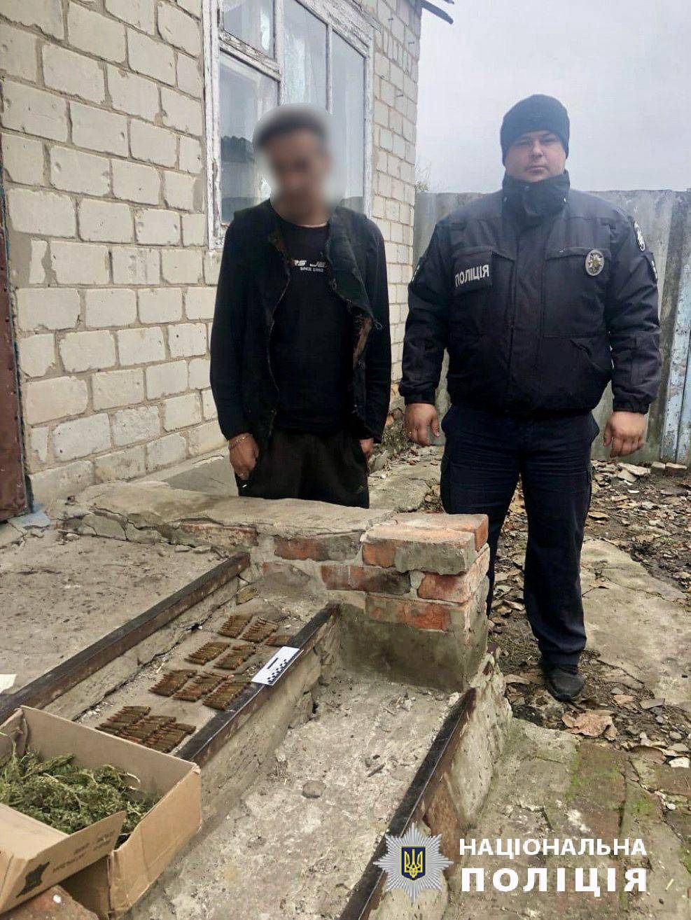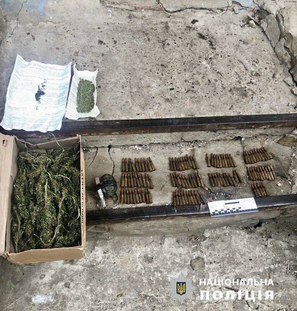 В ході обшуку в домоволодінні виявлені сухі гілки коноплі та згортки з марихуаною. Також поліцейські вилучили у чоловіка предмет, зовні схожий на гранату Ф-1, та 105 патронів калібру 5,45 мм.