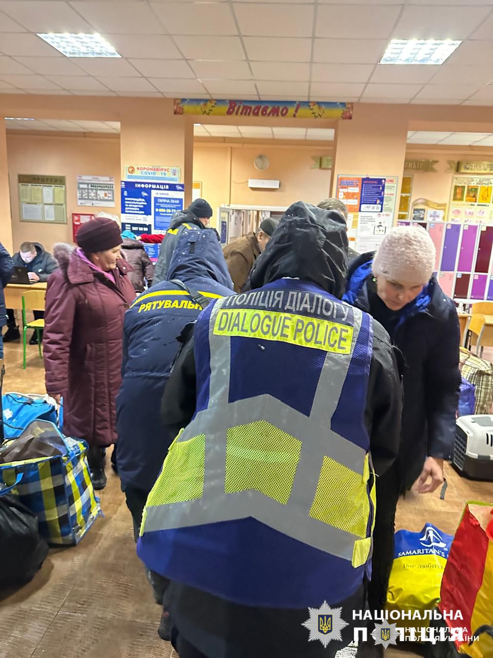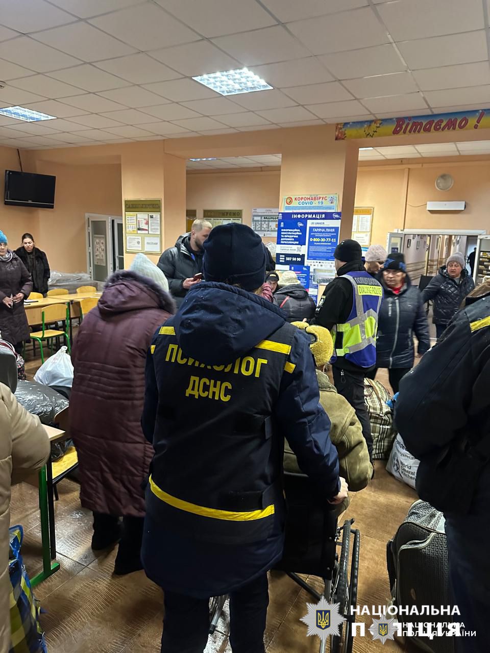 Тут громадяни перебувають у безпечному місці та очікують подальшого розподілення, а працівники поліції допомагають маломобільним особам та людям похилого віку.