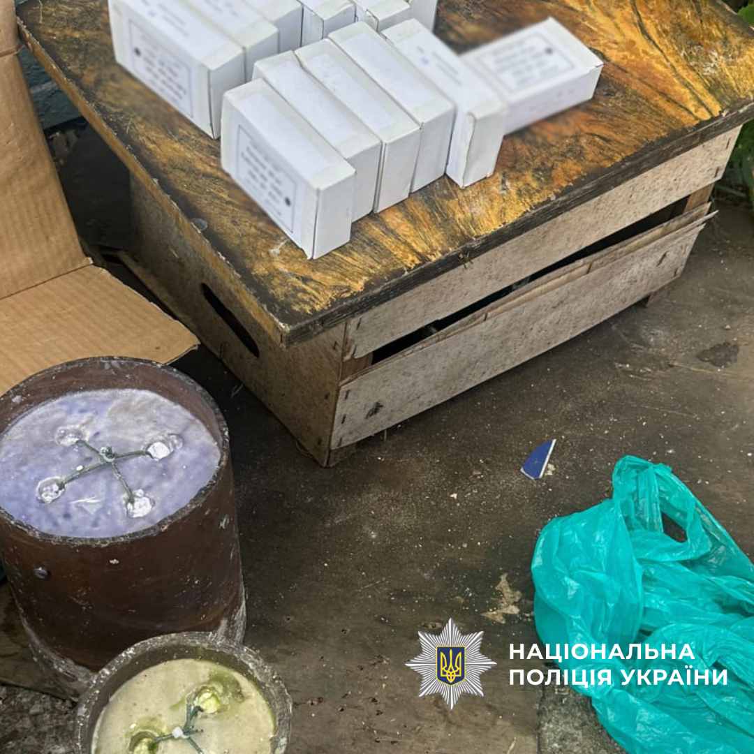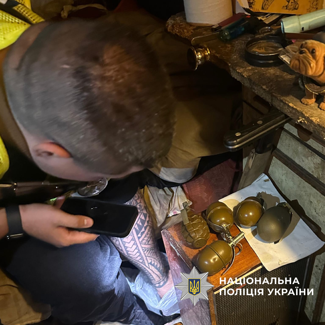 Під час проведення санкціонованого обшуку виявлено підривачі до ручних осколкових гранат, корпуси ручних гранат РГД-5 та Ф-1, реактивний сигнальний патрон, 360 набоїв, ручні димові гранати та саморобні димові шашки.