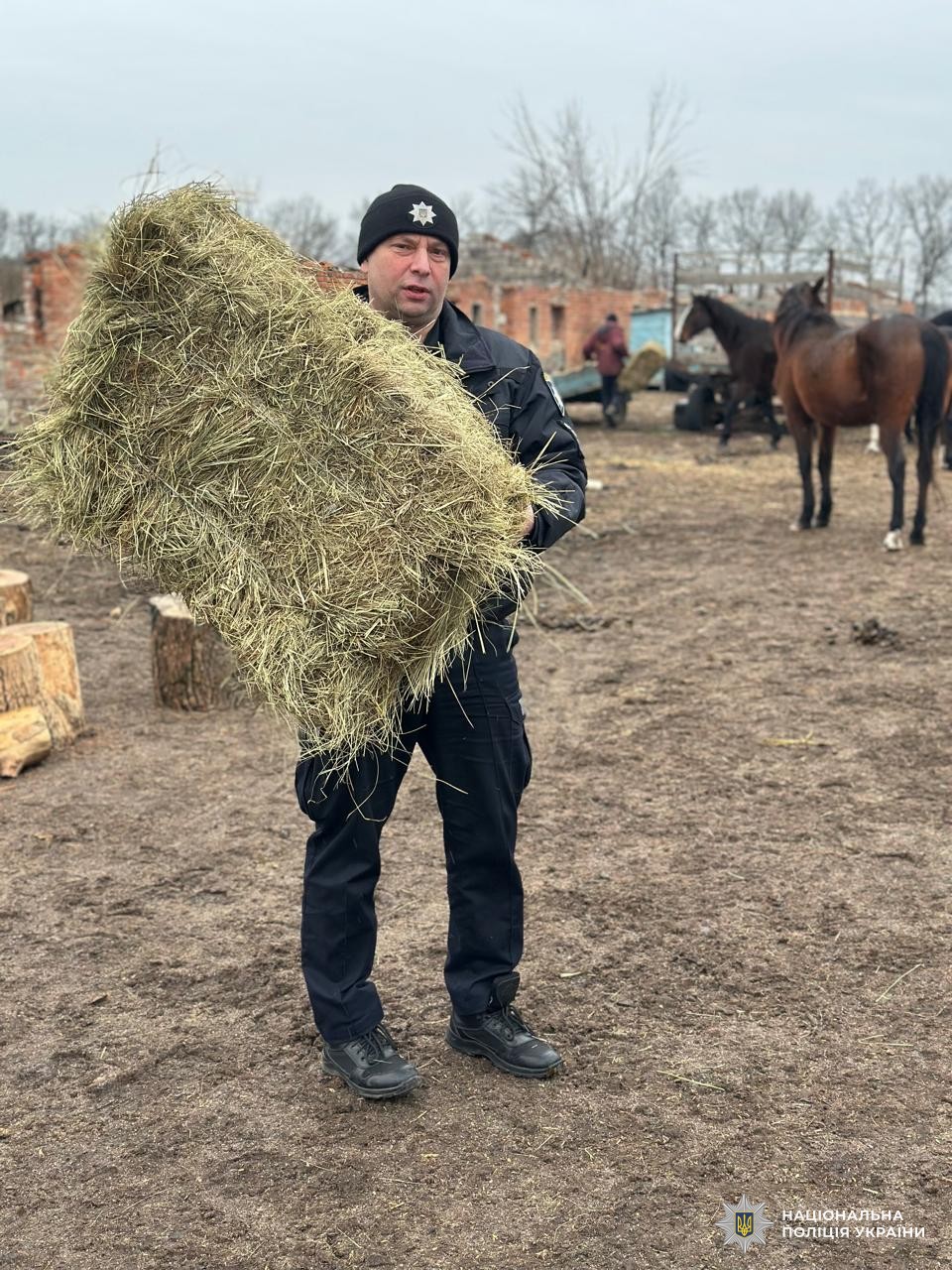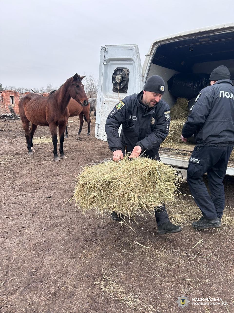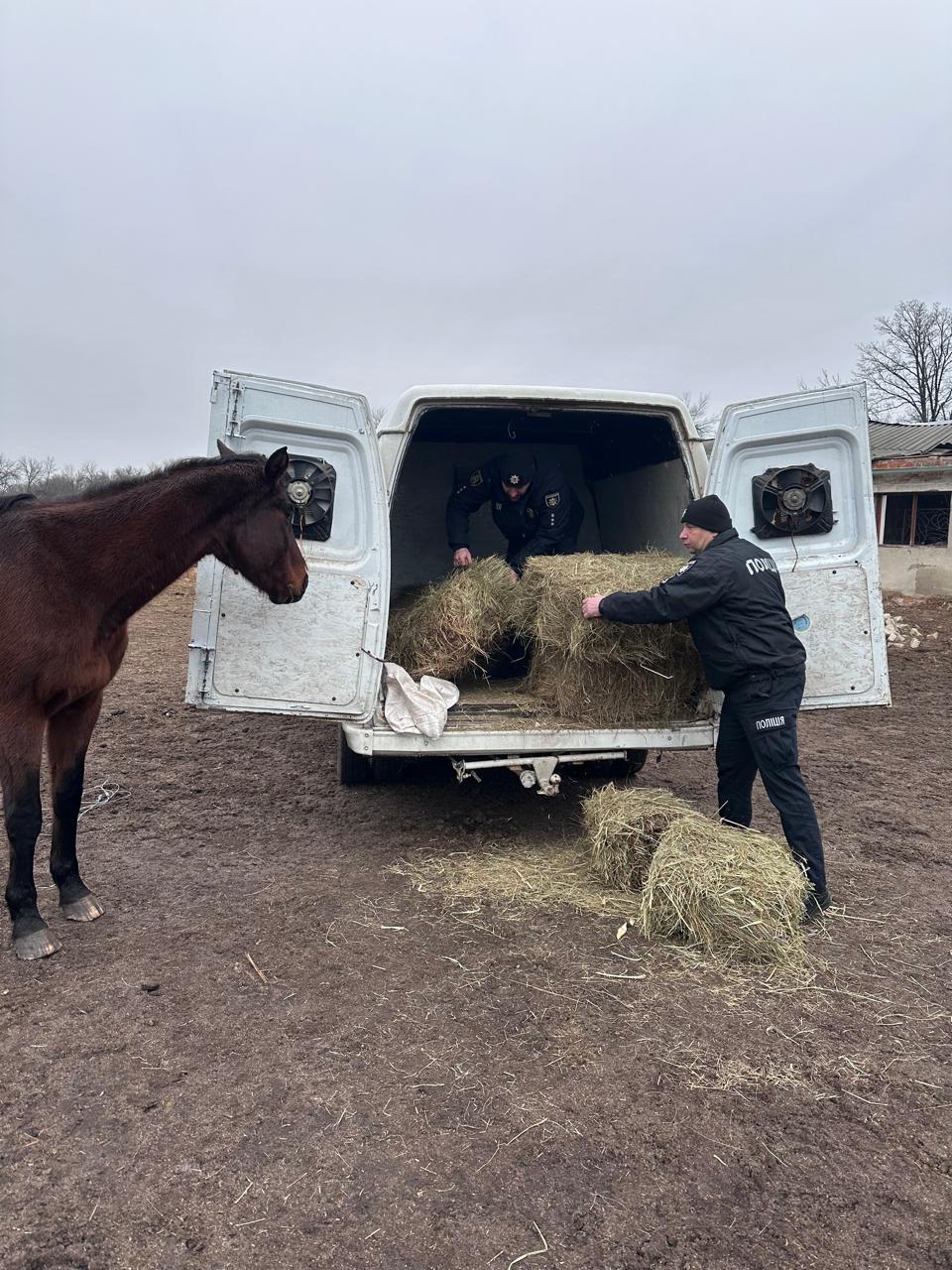15 січня поліцейські та представники громадської організації «Animals911Ukraina» доставили сіно, овес, солому та вітамінізовану сіль для коней та маленьких лошат.