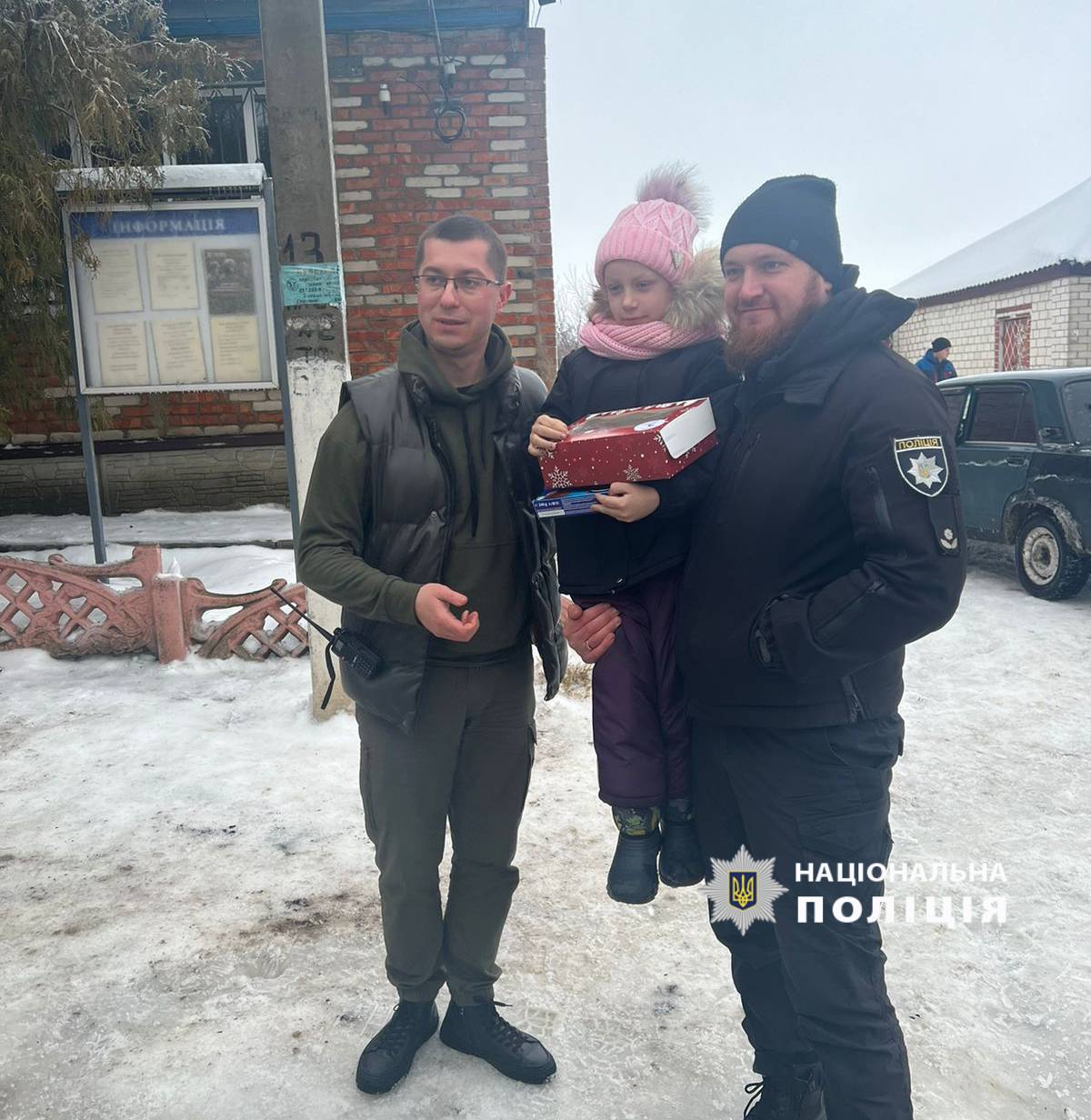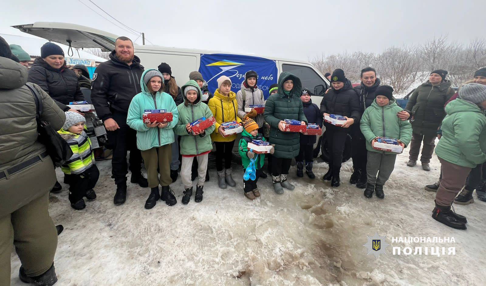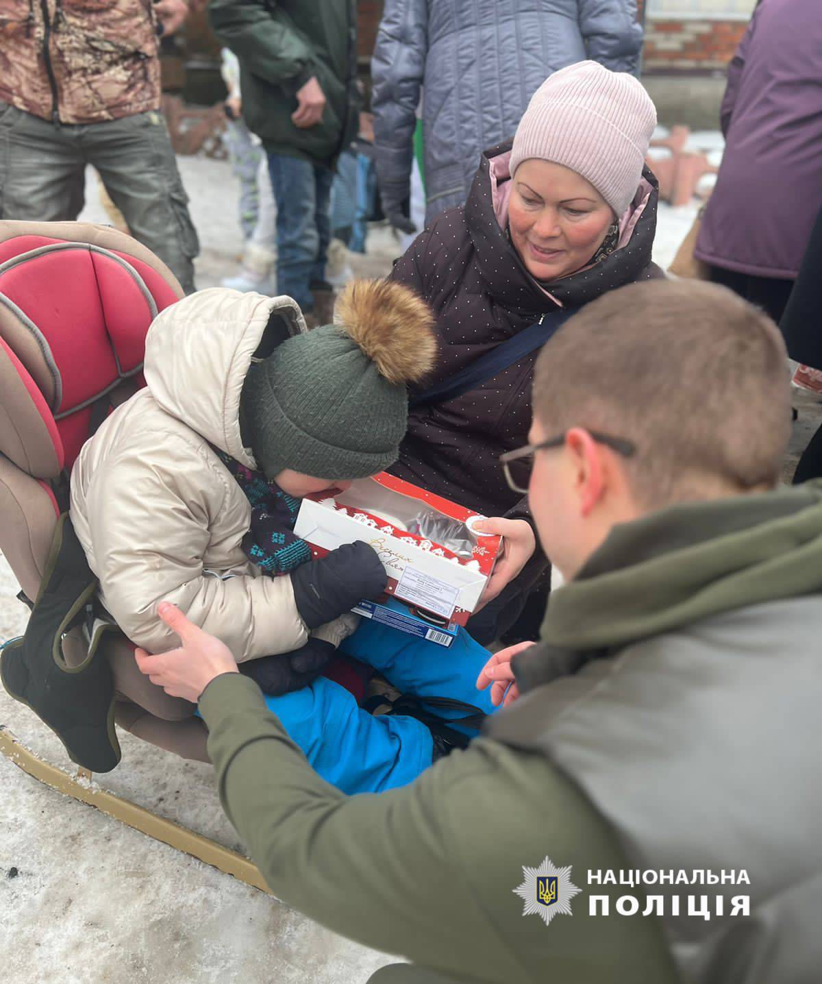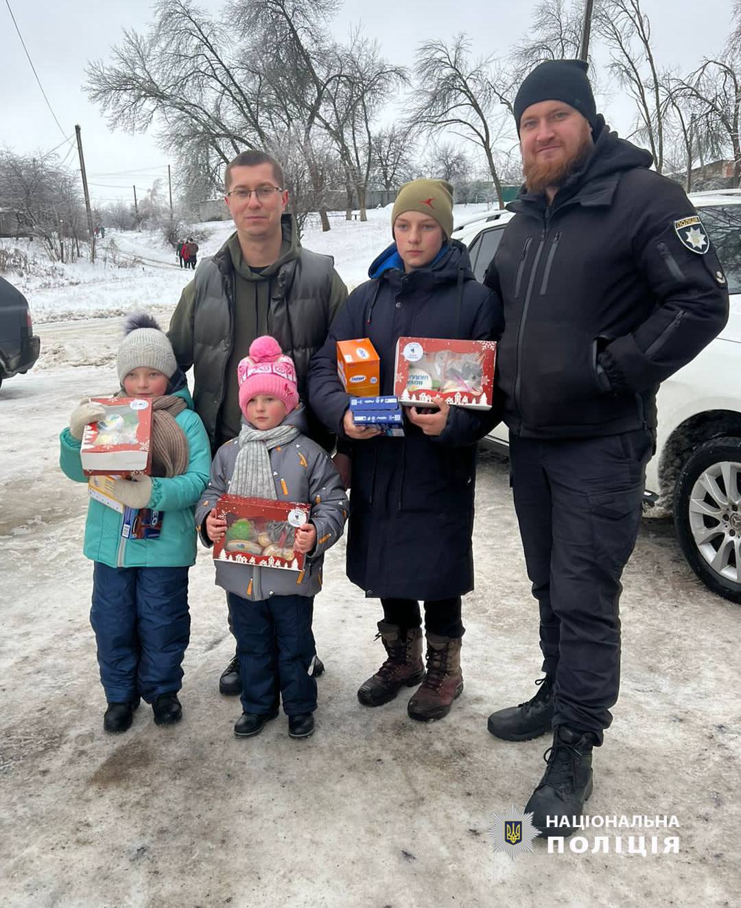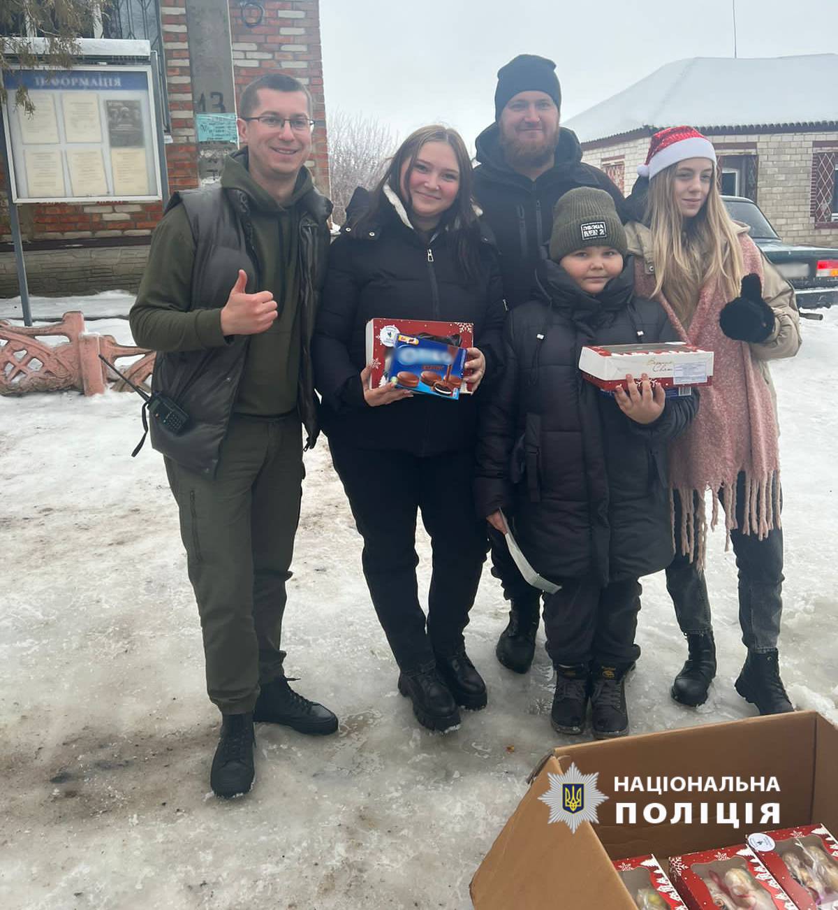 Правоохоронці та волонтери привітали маленьких жителів з новорічними святами та подарували солодощі.