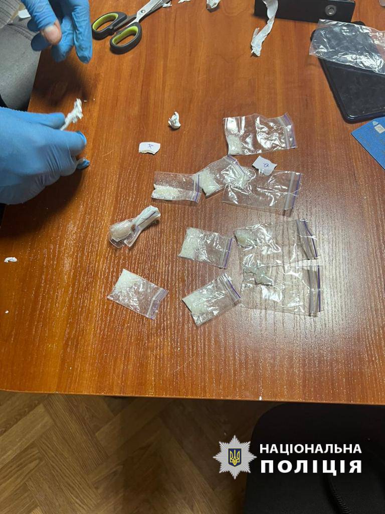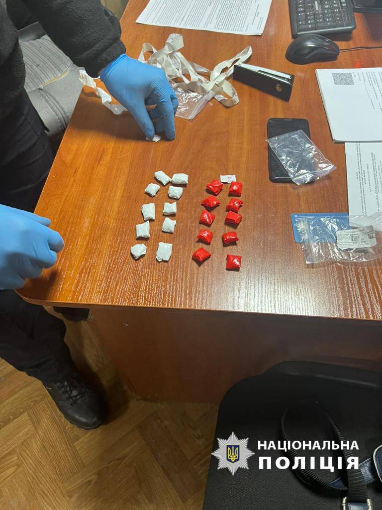 Під час обшуку у зловмисника вилучені 20 згортків з речовиною білого кольору, схожою на наркотичну.