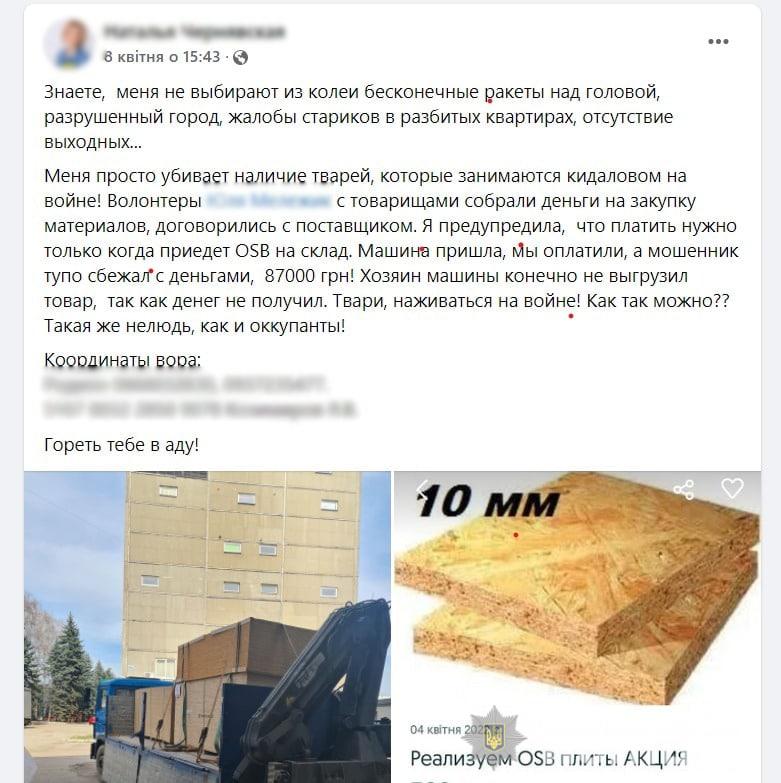 Зловмисник такого матеріалу не мав, тому знайшов в мережі Інтернет реальне оголошення та зробив замовлення. Коли машина з матеріалом прибула, жінка перерахувала гроші на картку чоловіка. Але власник автівки з товаром кошти не отримав і не дав забрати вантаж.