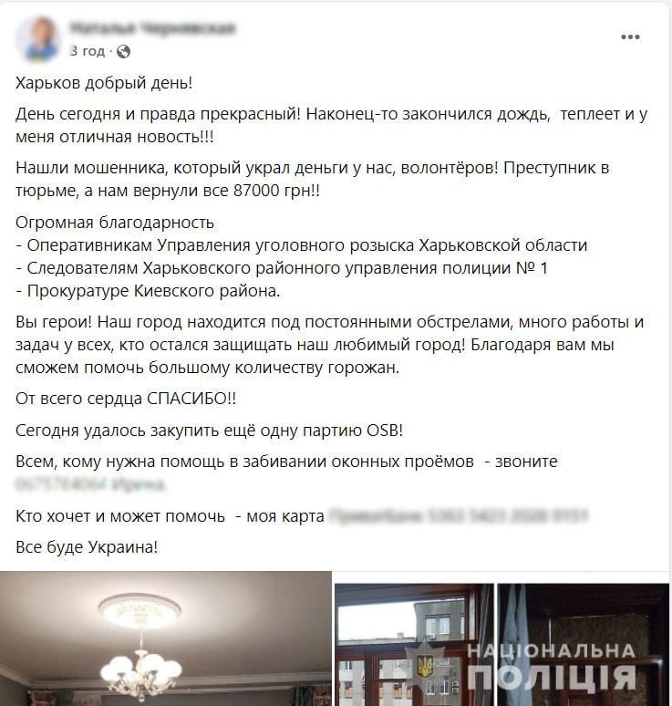 36-річний харків’янин заволодів грошима волонтерів, які ті збирали на ремонт пошкоджених вікон харків’ян. Зловмиснику повідомлено про підозру у скоєнні злочину.