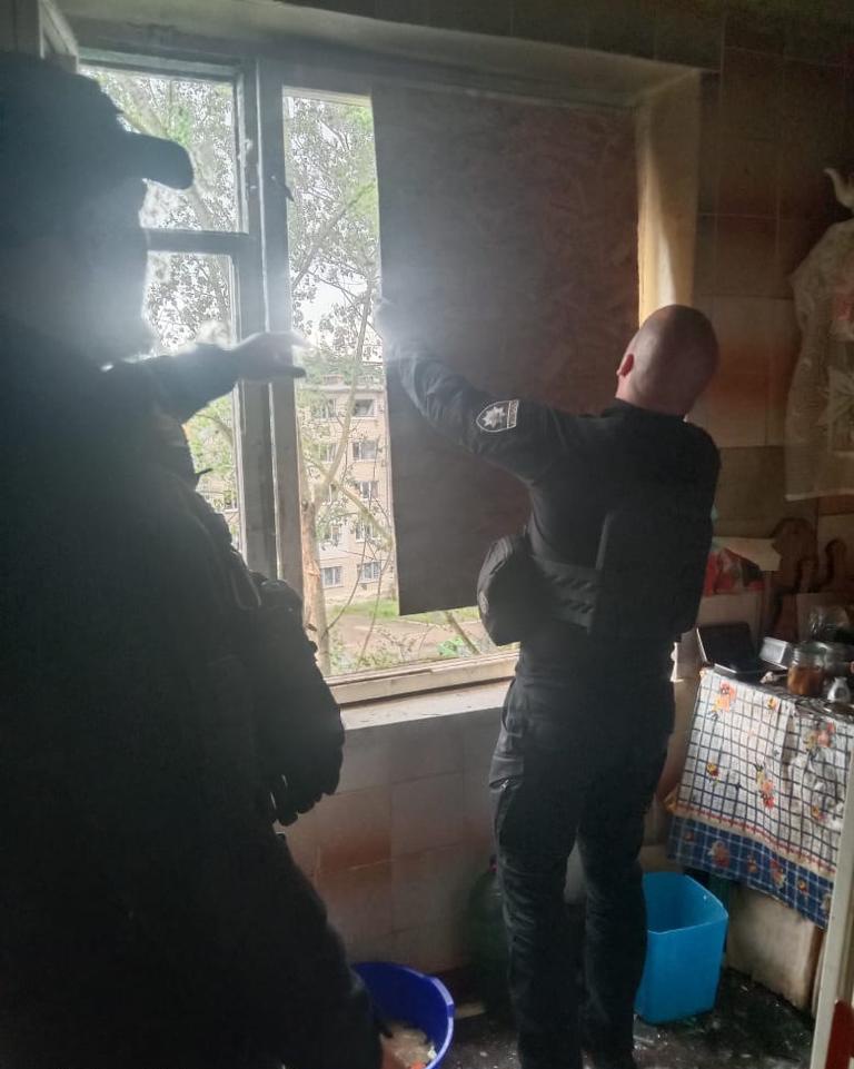 Правоохоронці у складі малих груп допомагають закривати вибиті вікна плитами ДСП у зруйнованих оселях.