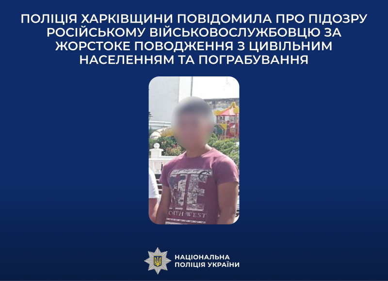 Поліція Харківщини повідомила про підозру російському військовослужбовцю за жорстоке поводження з цивільним населенням та пограбування