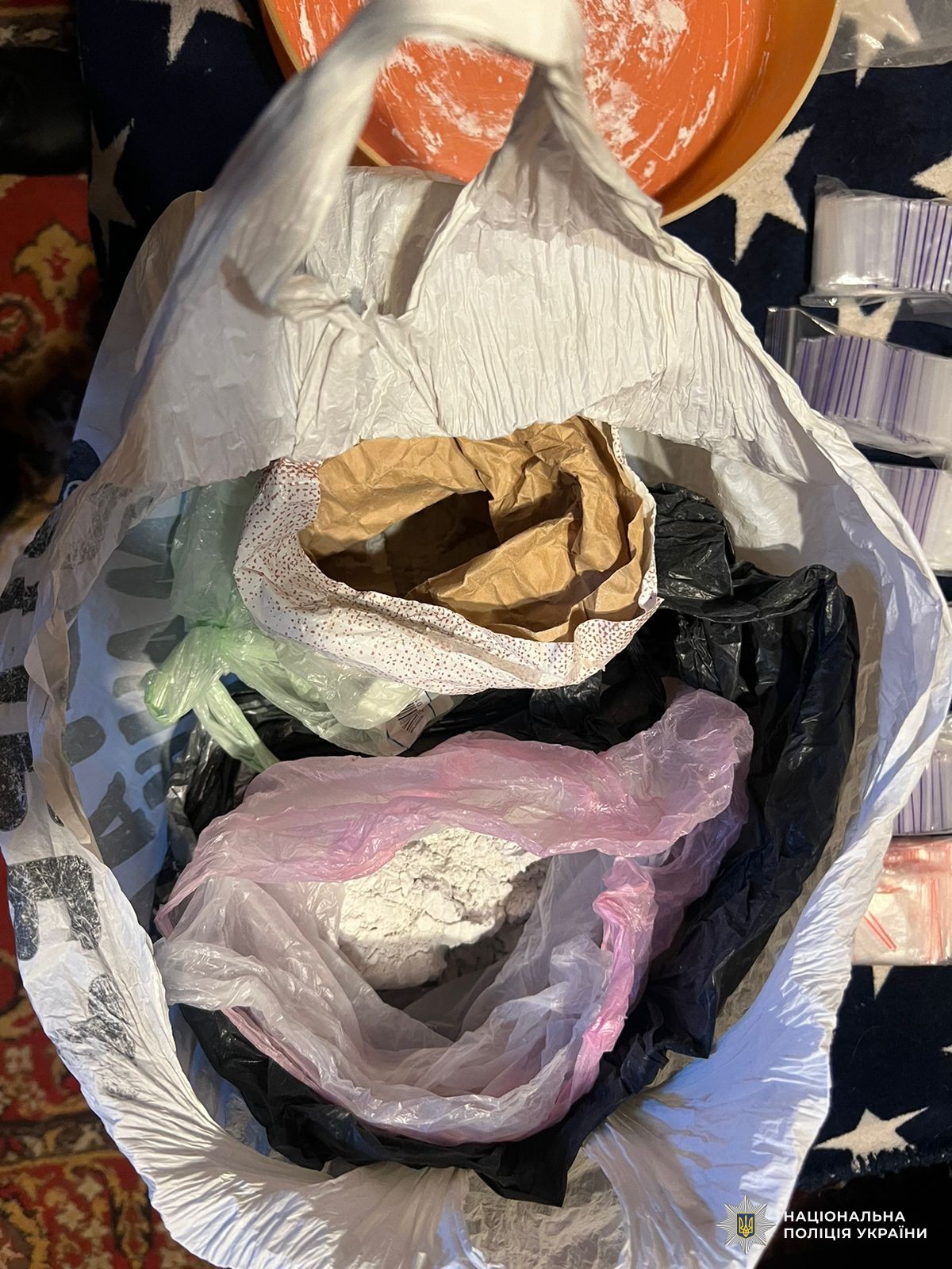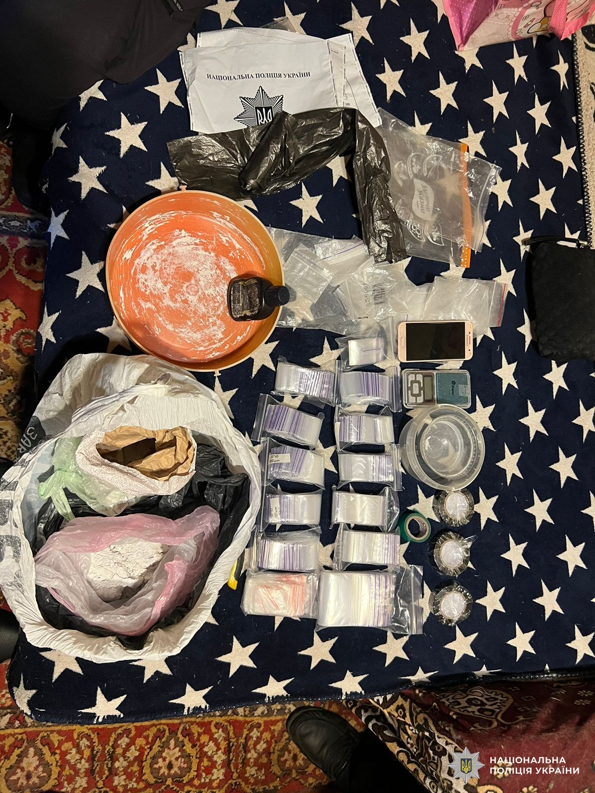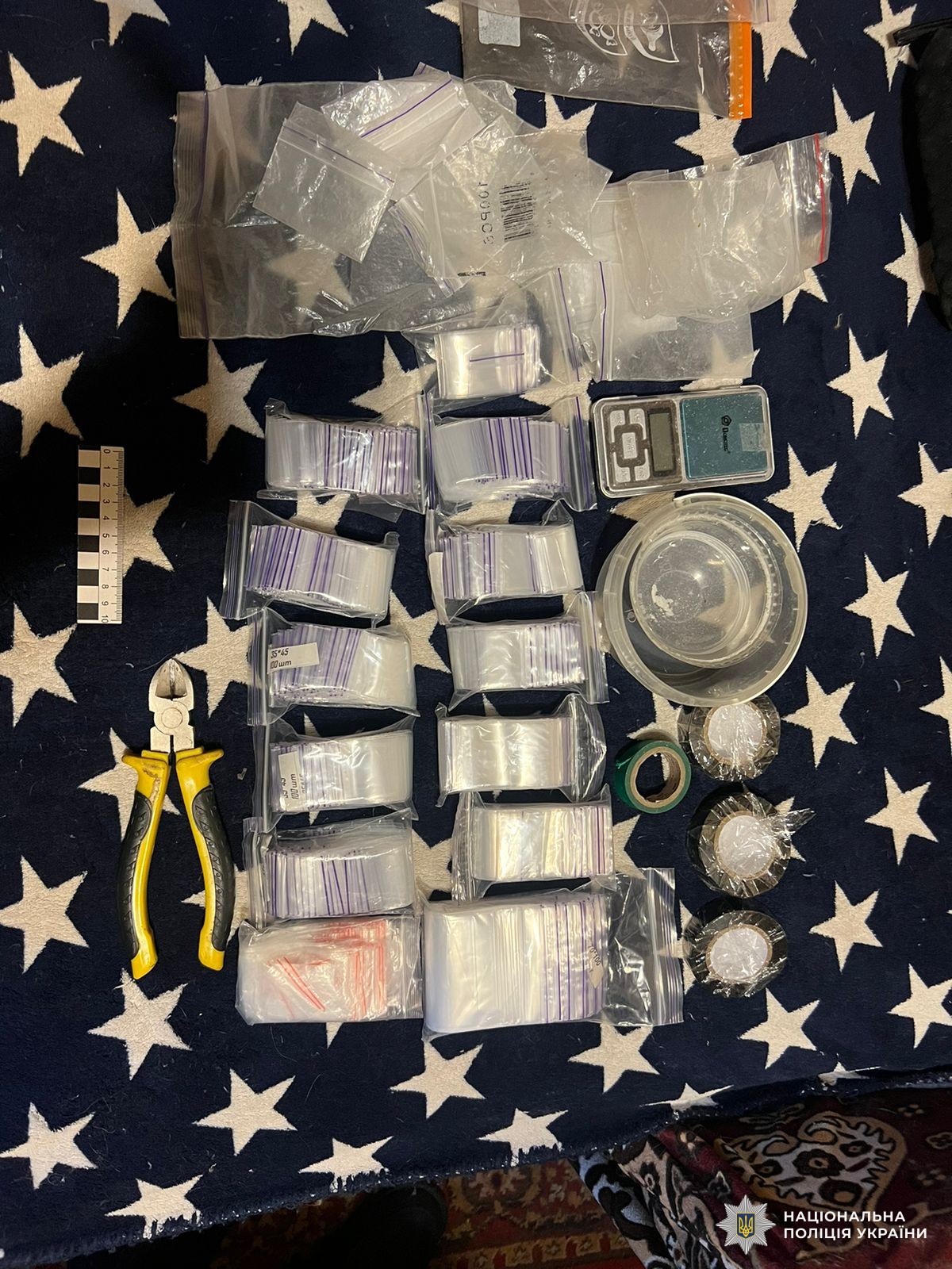 В результаті огляду місця проживання жінки було виявлено та вилучено пусті полімерні зіп-пакети, електронні ваги з залишками метадону, посуд, ізолента, інші знаряддя для фасування наркоречовин та виготовлення «закладок». Метадон порушниця фасувала по 0,5 грами у зіп-пакети та робила закладки для інтернет-крамниці.