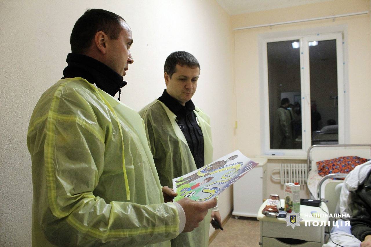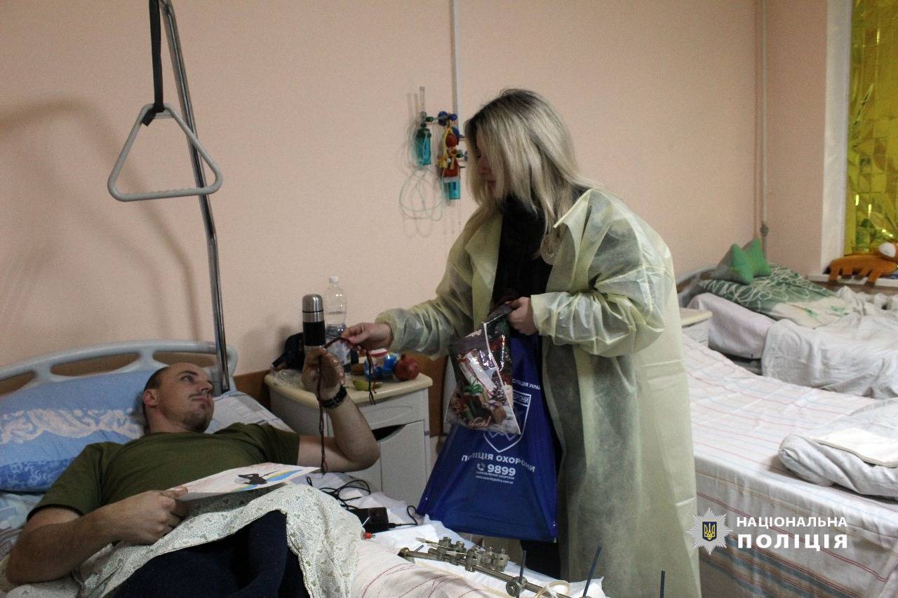 З нагоди різдвяних свят офіцери Управління поліції охорони в Харківській області відвідали військових, які перебувають на лікуванні, та передали солодкі подарунки, а також малюнки, вітальні листівки, обереги.