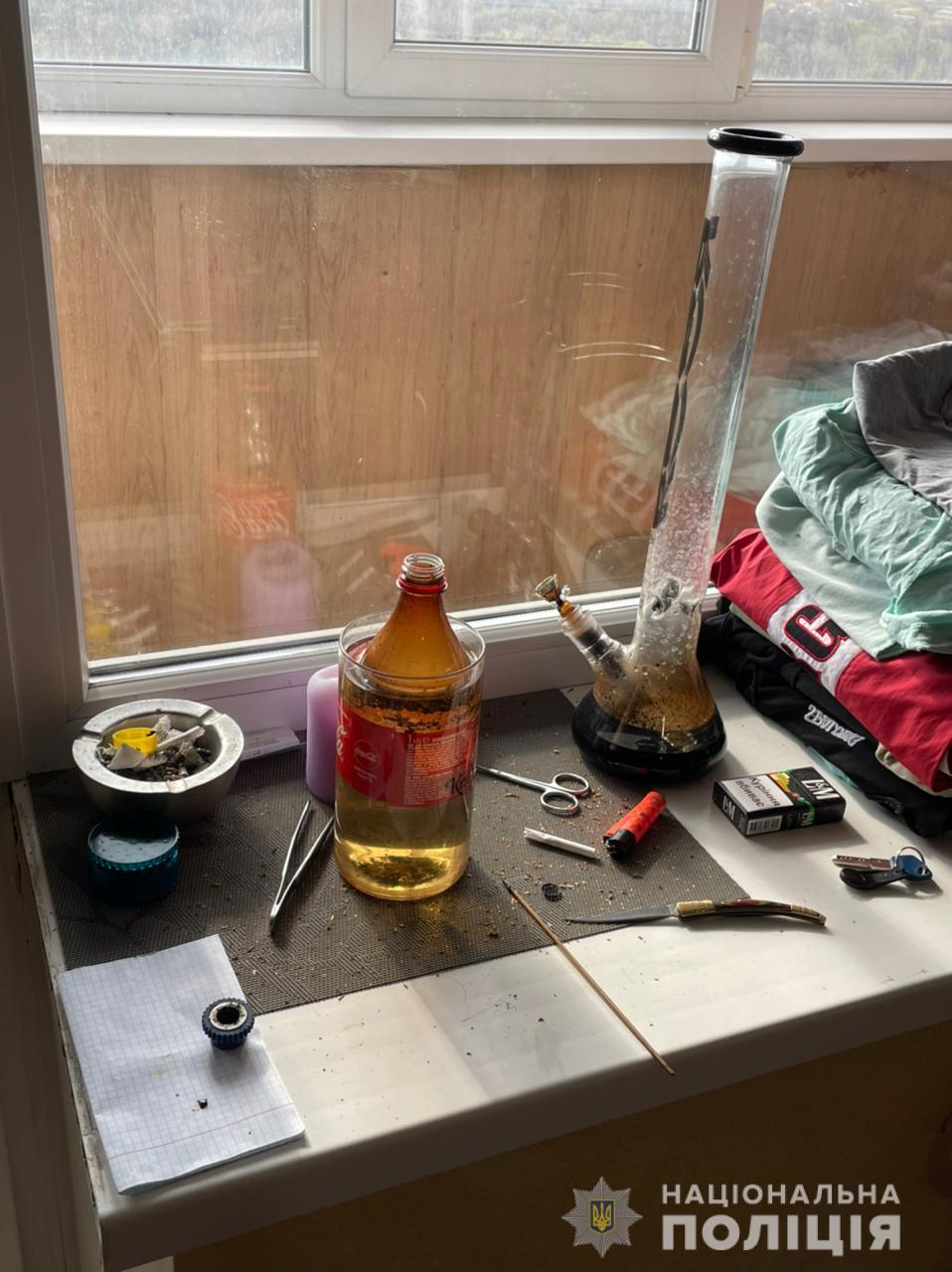 В квартирі 29-річного чоловіка на вулиці Клочківській поліцейські виявили чотири скляні банки об’ємом близько 0,5 літрів, в яких знаходилась речовина рослинного походження сіро-зеленого кольору. Також працівники поліції вилучили два полімерних пакунки з аналогічною речовиною загальною масою близько 200 грамів, речовину невстановленого походження коричневого кольору, електронні ваги, пристрої для вживання наркотиків з темно-коричневим нашаруванням, мобільний телефон.