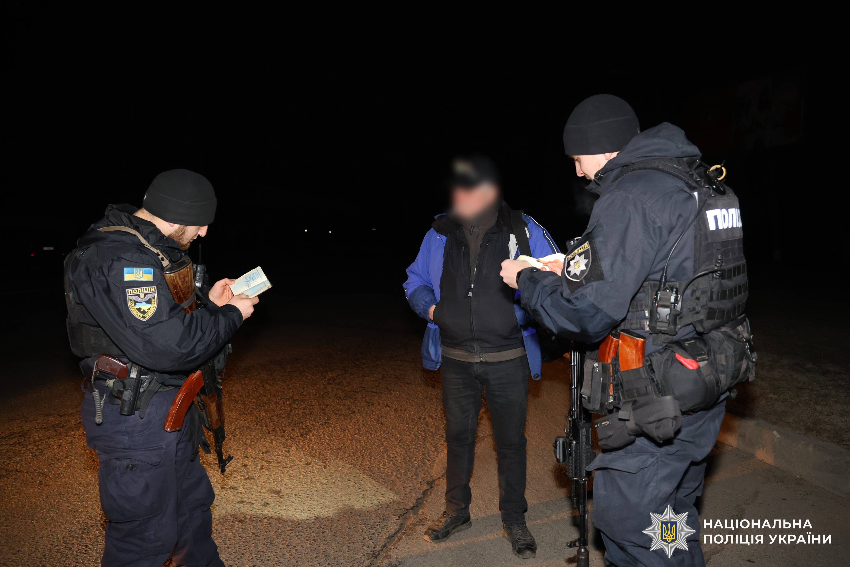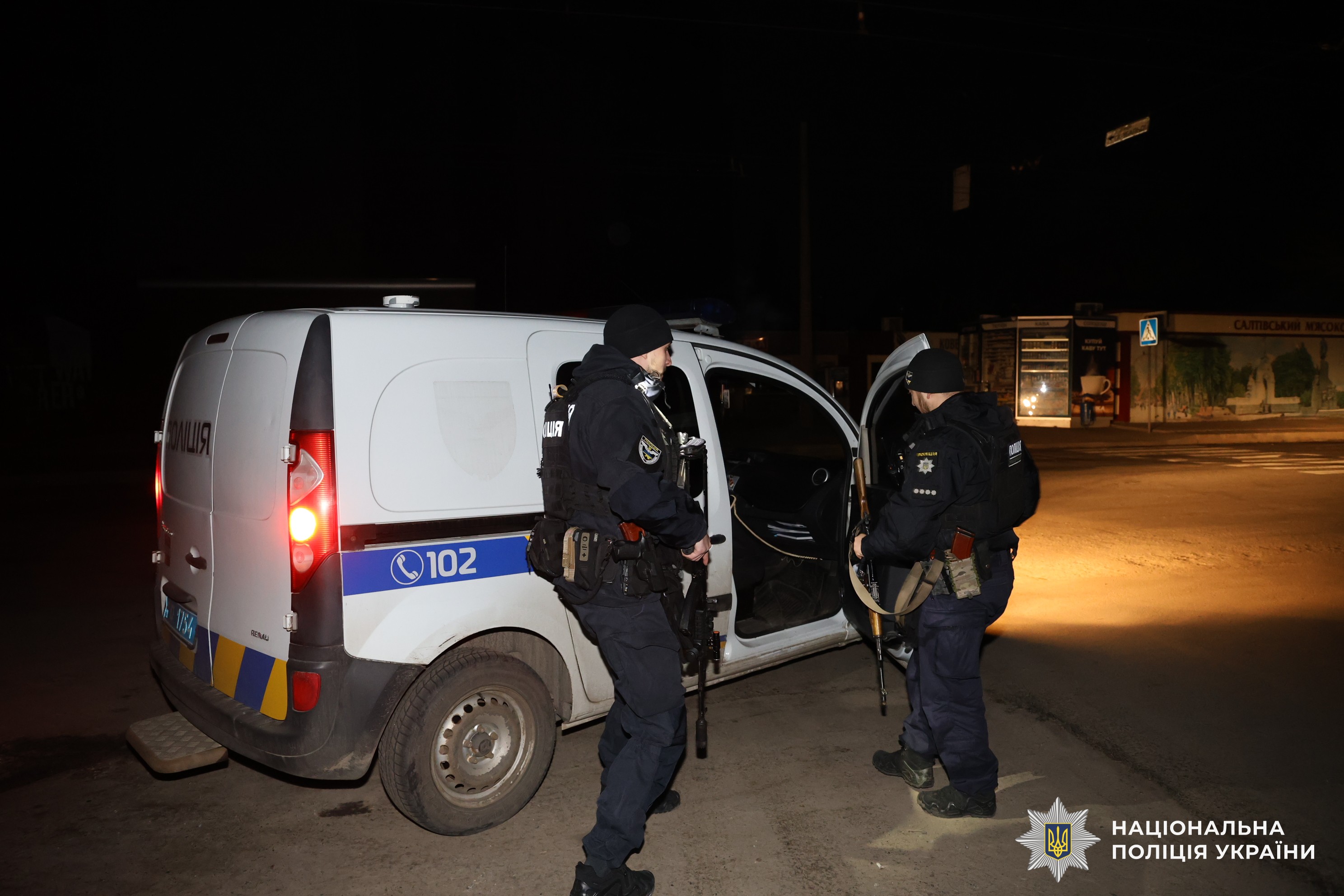 Працівники полку поліції особливого призначення ГУНП в Харківській області у нічний час здійснюють патрулювання міста. Правоохоронці перевіряють транспортні засоби, що рухаються в порушення комендантської години. Також перевіряють документи у громадян. Тих, хто не може дістатися додому через відсутність транспорту, довозять до місця мешкання.