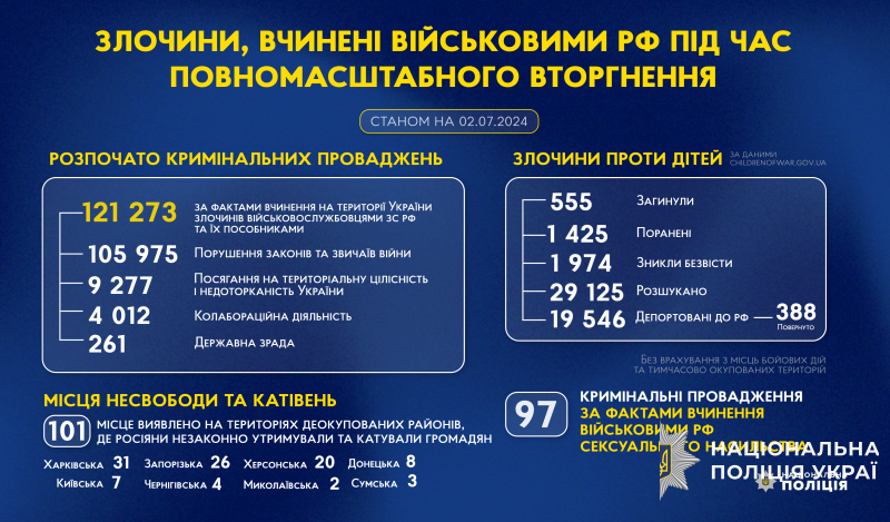 З початку повномасштабного вторгнення росії в Україну слідчі Національної поліції України розпочали 121 273 кримінальних проваджень за фактами вчинення на території України злочинів військовослужбовцями збройних сил російської федерації та їхніми пособниками.