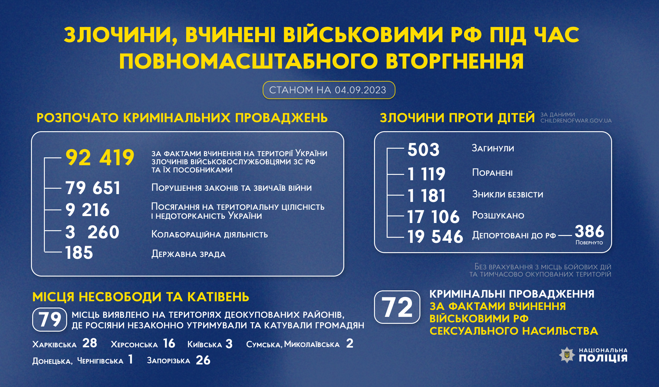 З початку повномасштабного вторгнення росії в Україну слідчі Національної поліції України розпочали 92 419 кримінальних проваджень за фактами вчинення на території України злочинів військовослужбовцями збройних сил російської федерації та їхніми пособниками.