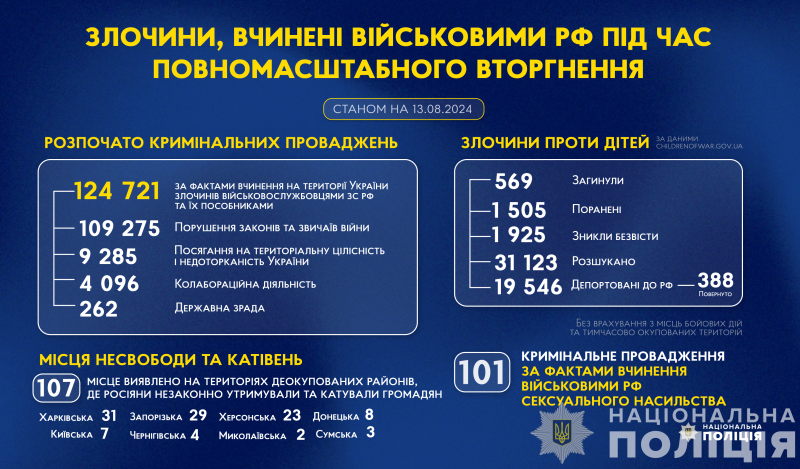 З початку повномасштабного вторгнення росії в Україну слідчі Національної поліції України розпочали 124 721 кримінальних проваджень за фактами вчинення на території України злочинів військовослужбовцями збройних сил російської федерації та їхніми пособниками.