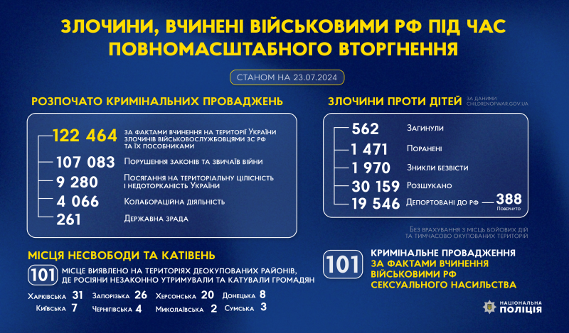 З початку повномасштабного вторгнення росії в Україну слідчі Національної поліції України розпочали 122 464 кримінальних проваджень за фактами вчинення на території України злочинів військовослужбовцями збройних сил російської федерації та їхніми пособниками.
