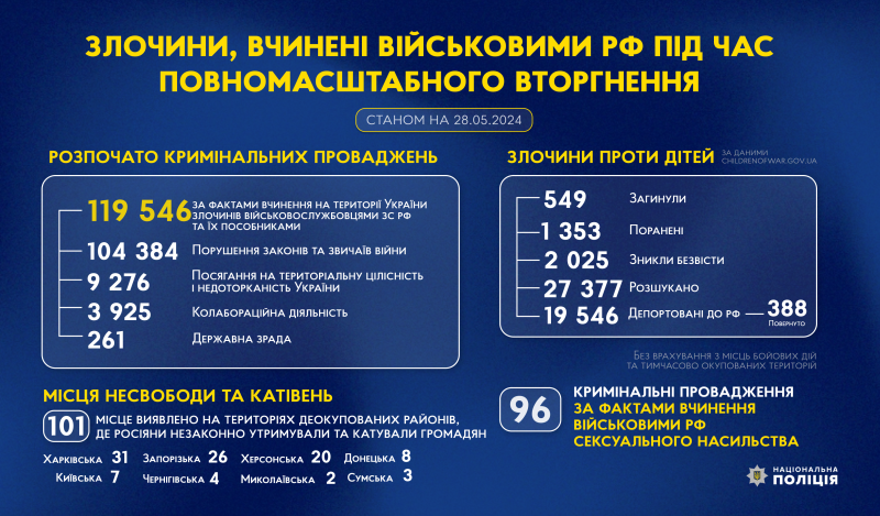 З початку повномасштабного вторгнення росії в Україну слідчі Національної поліції України розпочали 119 546 кримінальних проваджень за фактами вчинення на території України злочинів військовослужбовцями збройних сил російської федерації та їхніми пособниками.